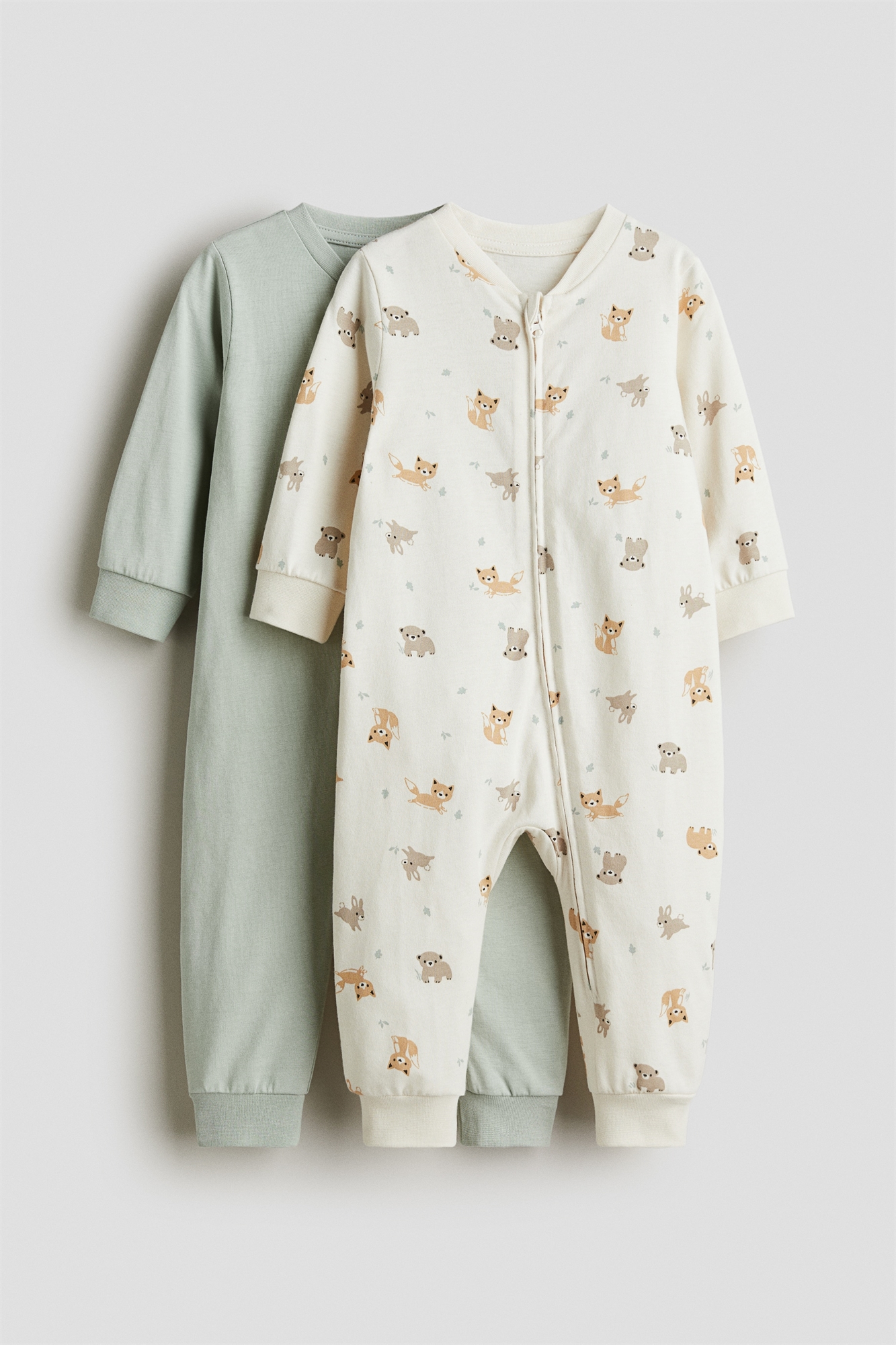 Спальные костюмы из мягкого хлопкового джерси. Длинные рукава, застежка-молния спереди с защитой подбородка от натирания, манжеты и кайма в рубчик.