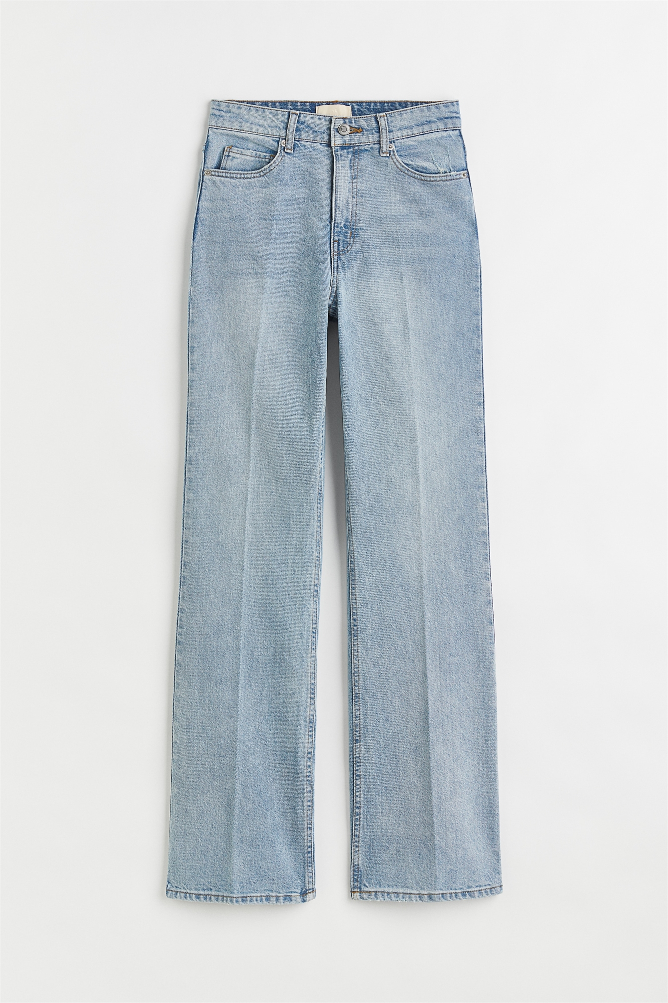 Джинсы с 5 карманами из хлопкового денима с зауженной талией, ширинкой на молнии и пуговице, прямыми ногами и складками спереди и сзади.