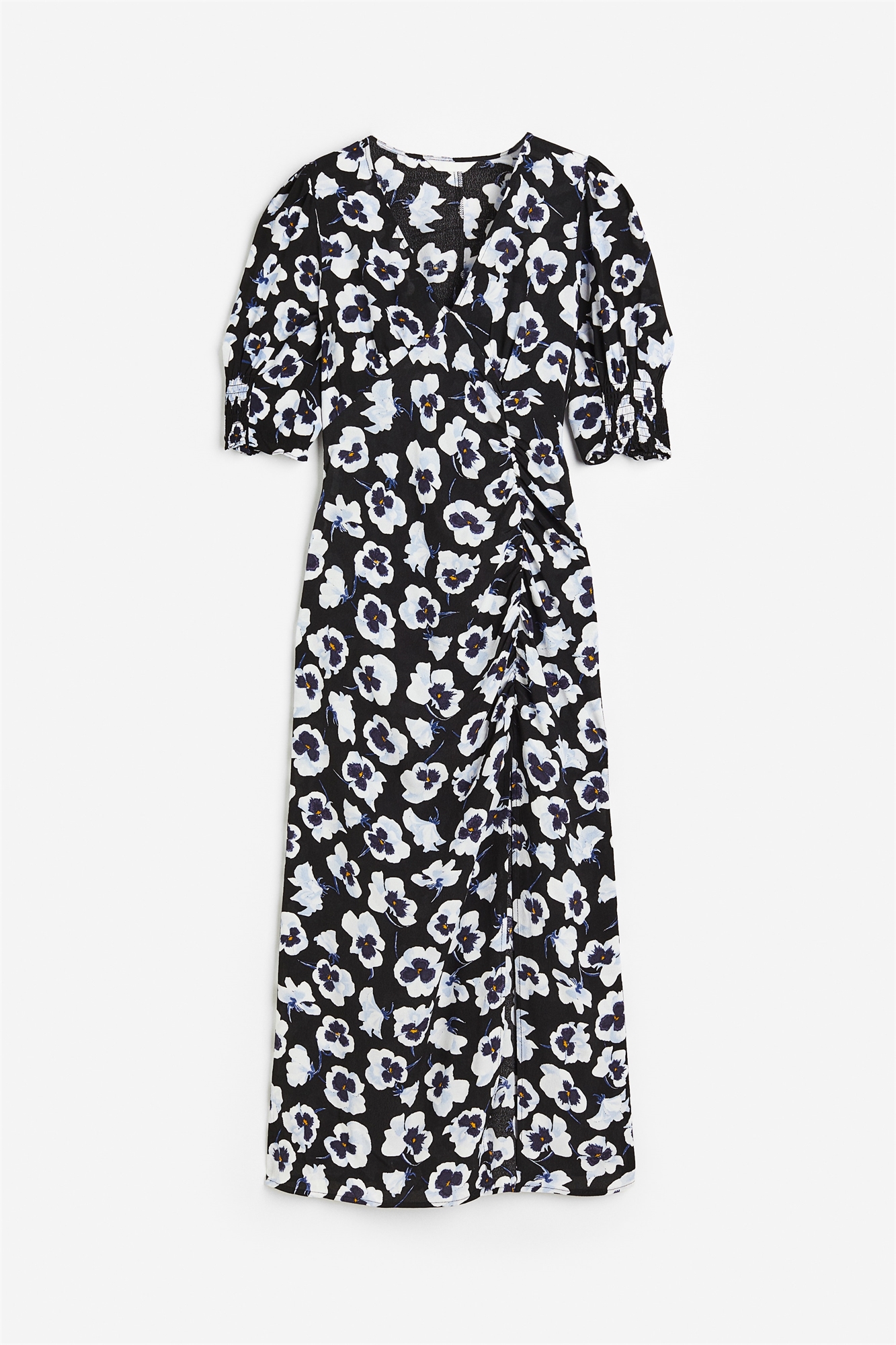 Длинное платье из вискозного крепа с V-образным вырезом, швом под бюстом и короткими пышными рукавами с отложными манжетами. Собранный шов спереди для эффекта драпировки, потайная застежка-молния с одной стороны и высокий разрез спереди на подоле. Без подкладки.