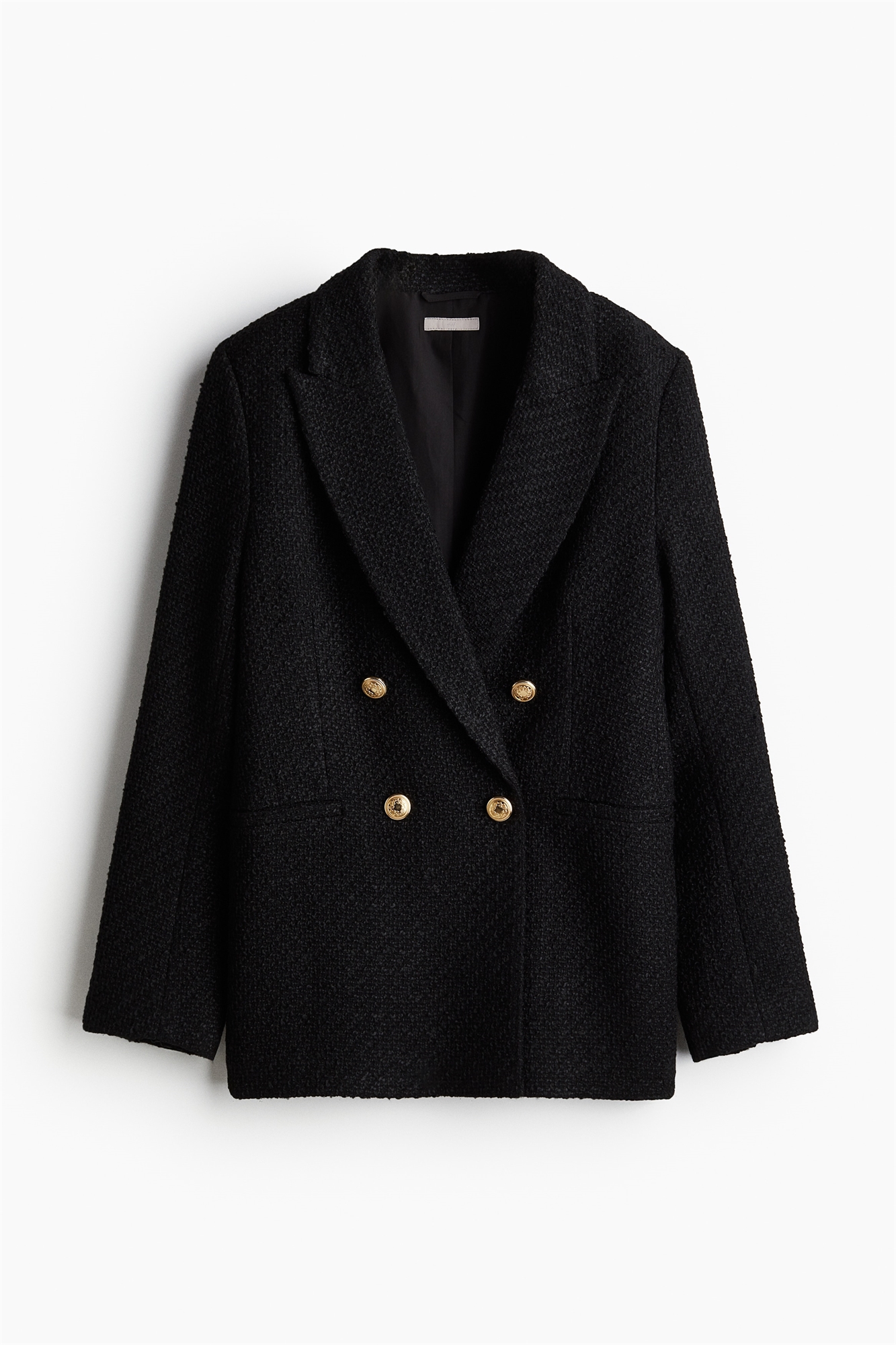 Двубортный блейзер из фактурного переплетения с пикообразными лацканами и пуговицами спереди. Неприметные втачные карманы спереди, декоративные пуговицы на манжетах и один вентиляционный канал сзади. На подкладке.