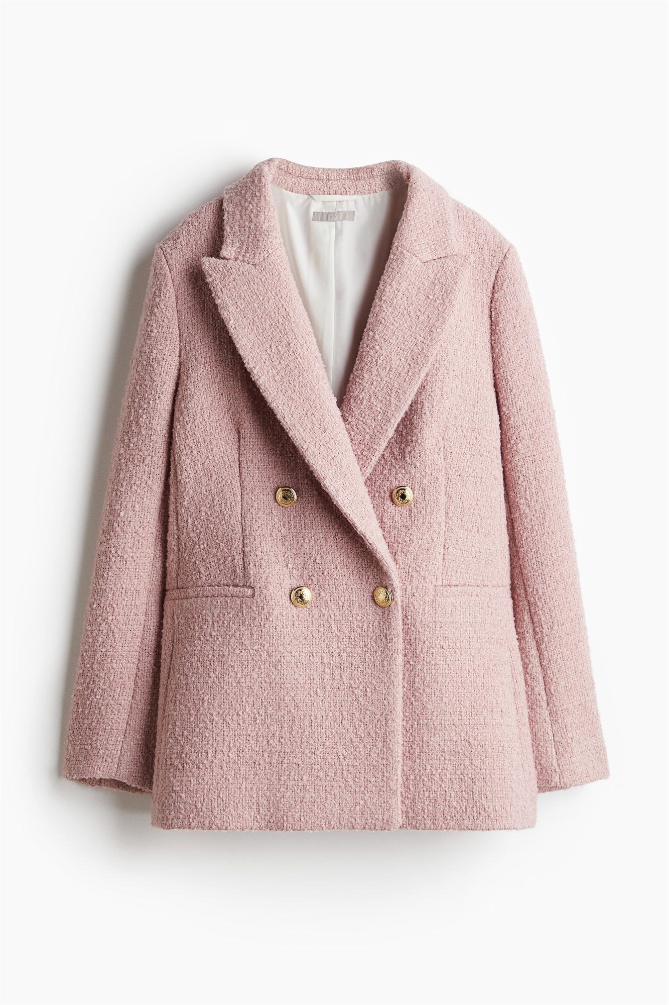 Двубортный блейзер из фактурного переплетения с пикообразными лацканами и пуговицами спереди. Неприметные втачные карманы спереди, декоративные пуговицы на манжетах и один вентиляционный канал сзади. На подкладке.