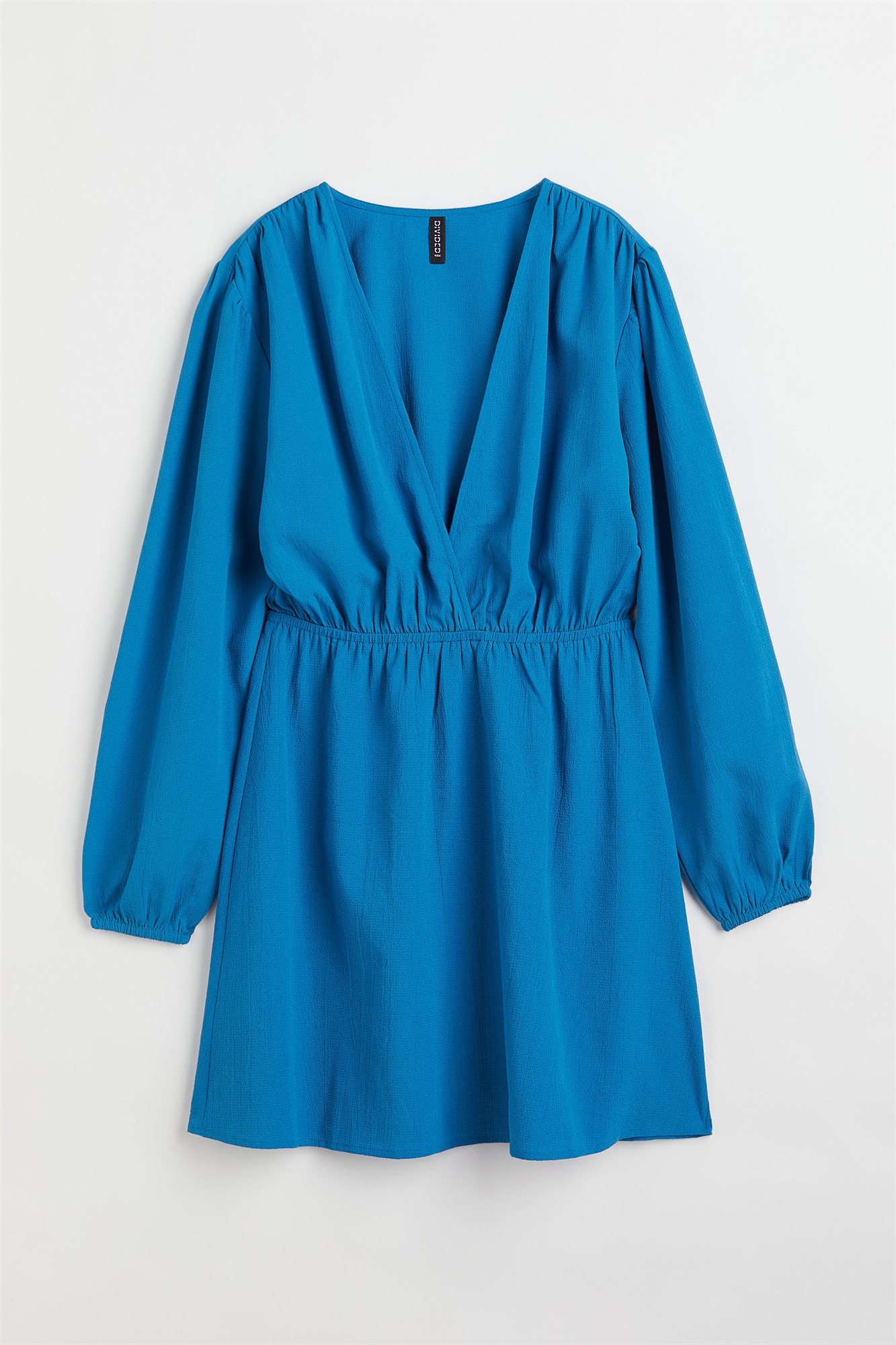 Короткое платье из креповой ткани. Модель с перекрывающимся V-образным вырезом, собранными плечевыми швами и длинными рукавами с узким эластичным подолом. Эластичная талия и слегка расклешенная юбка. Без подкладки.