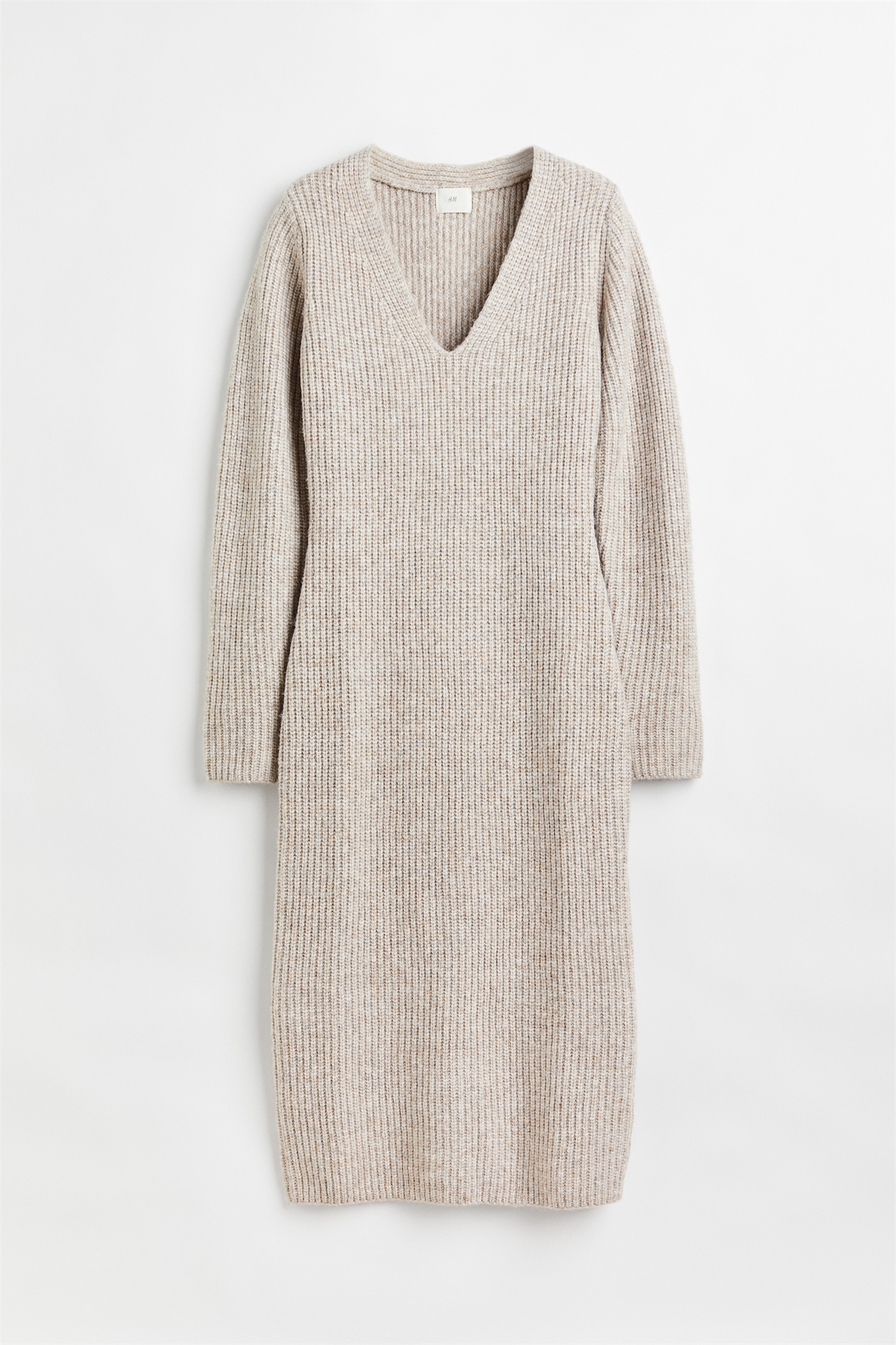 Приталенное платье длиной до икр из ребристого трикотажа с добавлением шерсти, с V-образным вырезом, длинными рукавами и прямым подолом.
