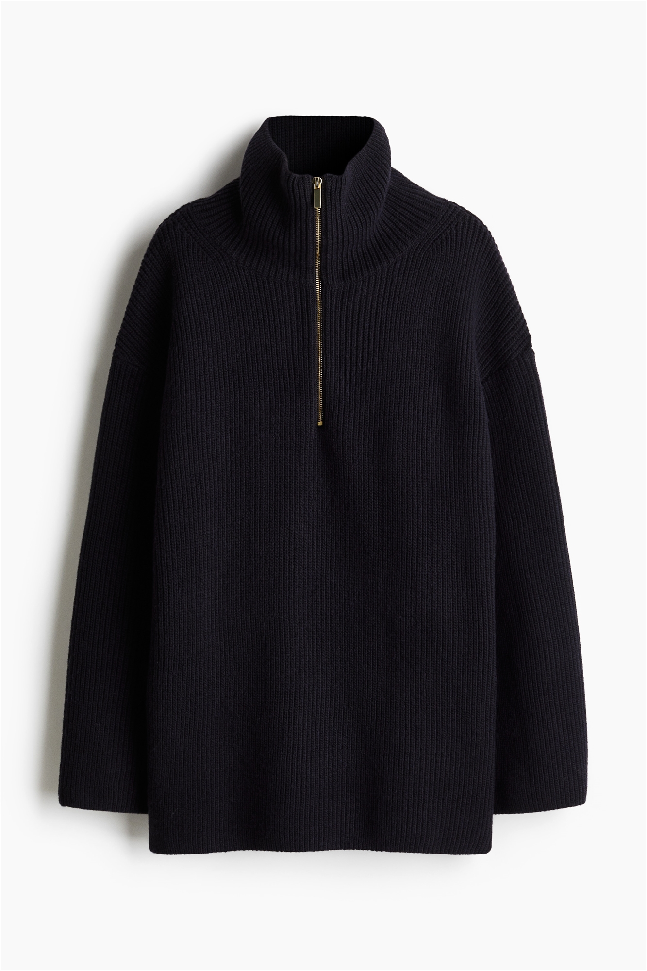 Джемпер из мягкого трикотажа в рубчик с добавлением шерсти. Свободный крой с высоким воротником, застежкой на молнию, спущенными плечами и длинными рукавами. Слегка наклоненные разрезы по бокам подола.