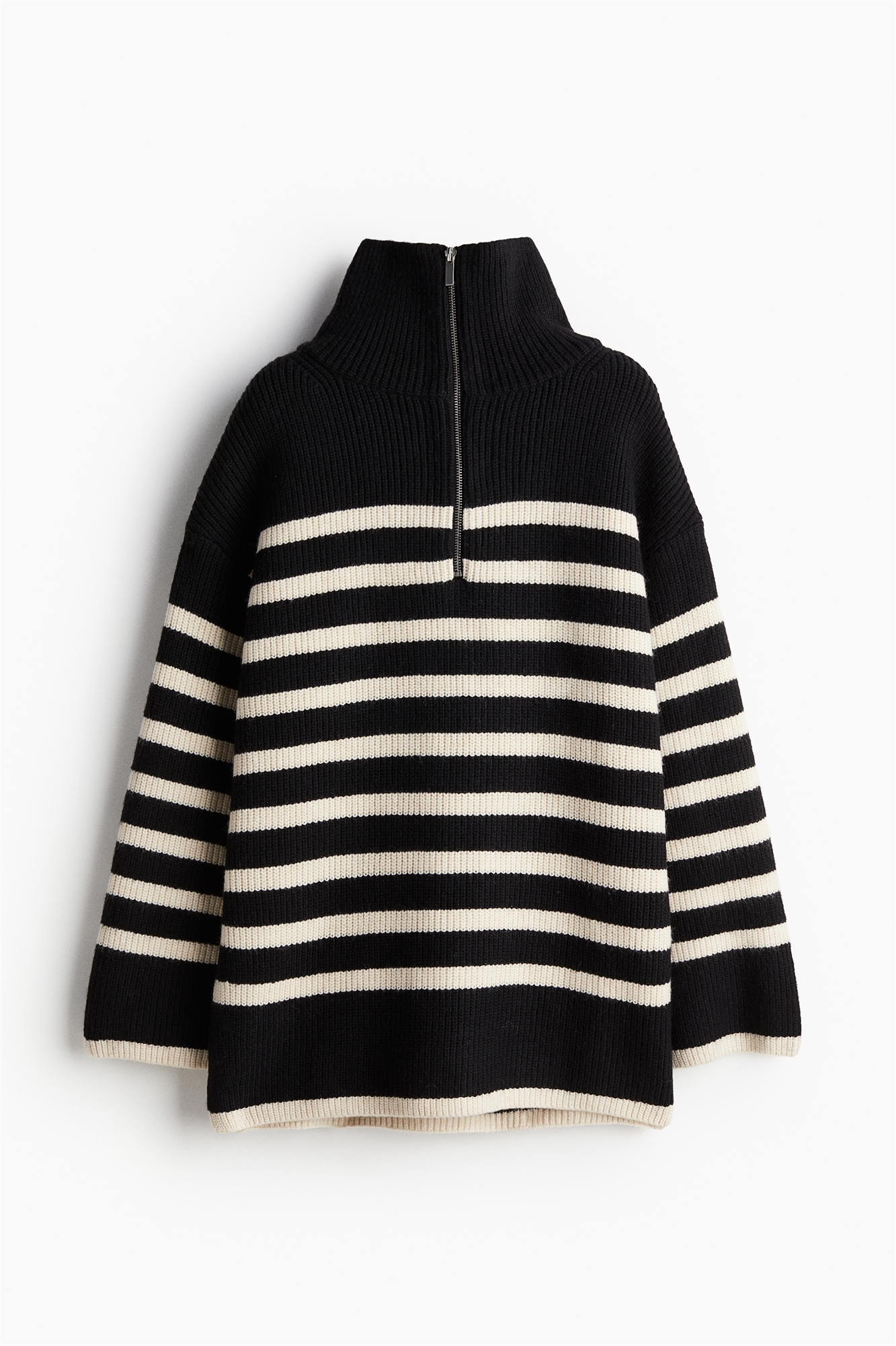 Джемпер из мягкого трикотажа в рубчик с добавлением шерсти. Свободный крой с высоким воротником, застежкой на молнию, спущенными плечами и длинными рукавами. Слегка наклоненные разрезы по бокам подола.