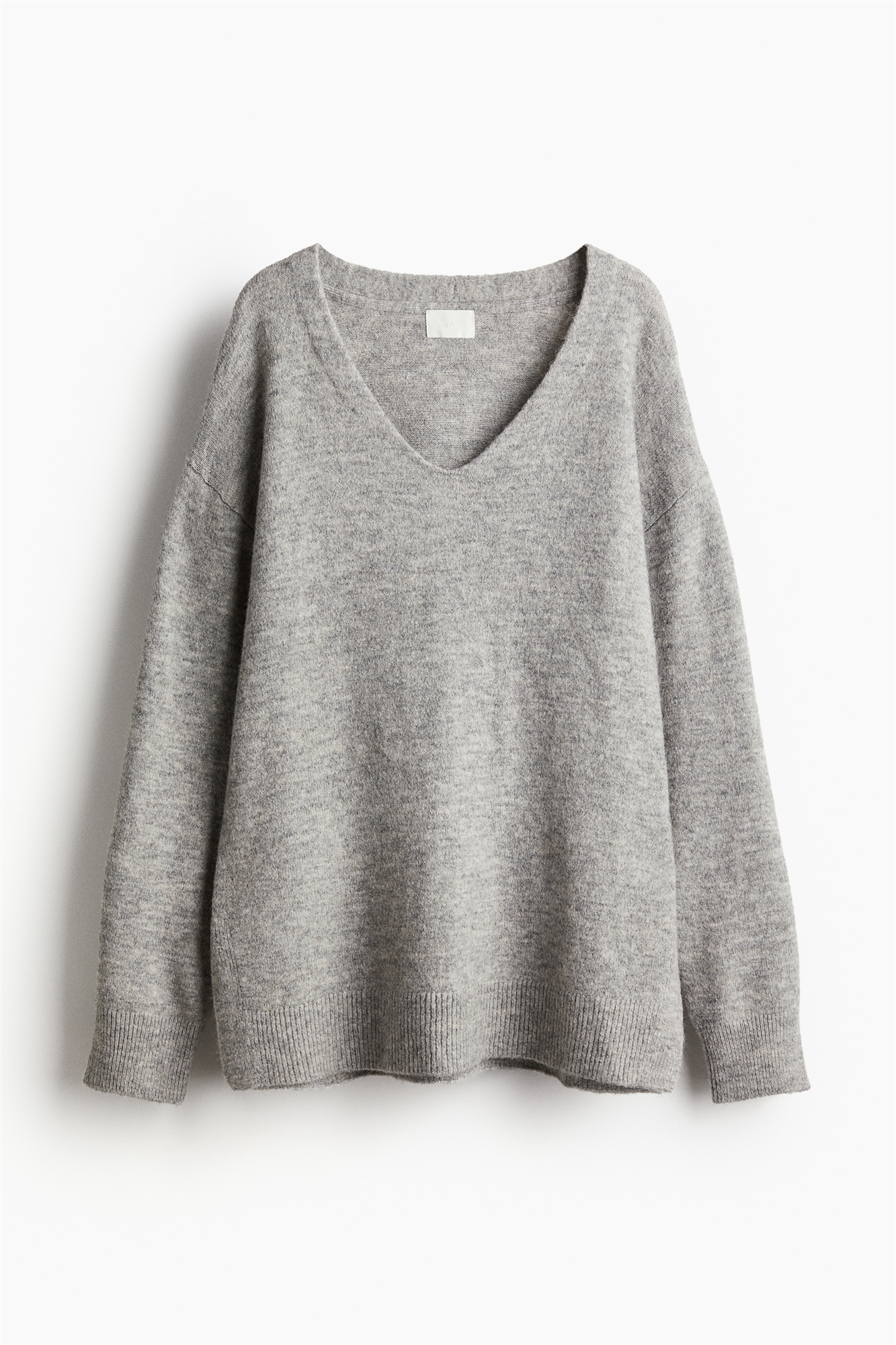 Джемпер больших размеров с V-образным вырезом горловины из мягкого тонкого трикотажа. Спущенные плечи, длинные рукава и окантовка по вырезу, манжетам и подолу. Разрезы по бокам подола.