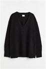 Джемпер больших размеров с V-образным вырезом горловины из мягкого тонкого трикотажа. Спущенные плечи, длинные рукава и окантовка по вырезу, манжетам и подолу. Разрезы по бокам подола.
