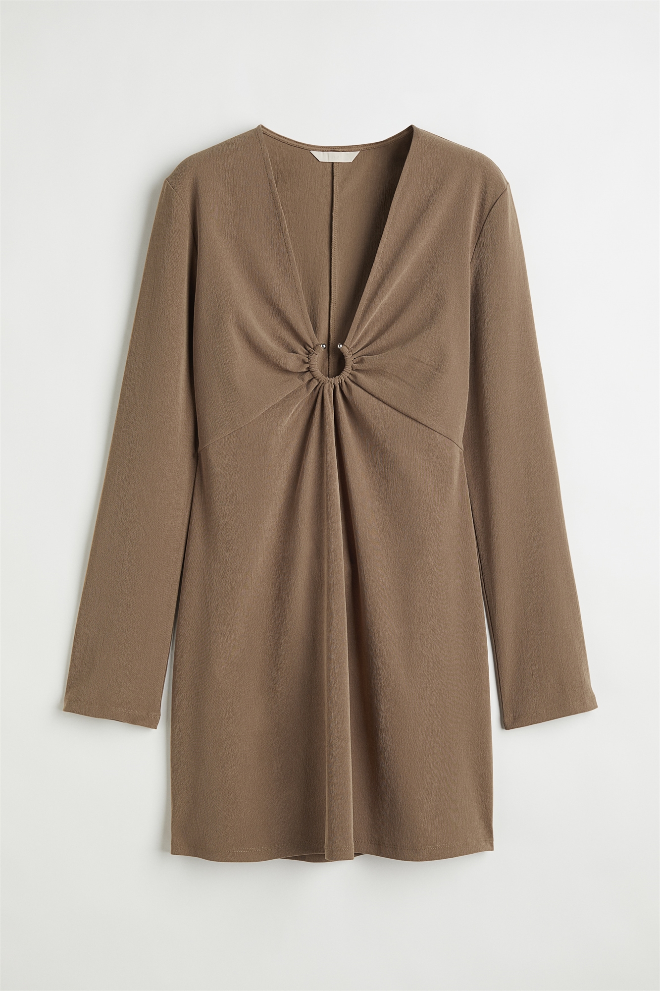 Короткое платье из мягко драпирующегося джерси. Нежный фасон A-line с глубоким V-образным вырезом и металлическим декором спереди, длинные рукава.