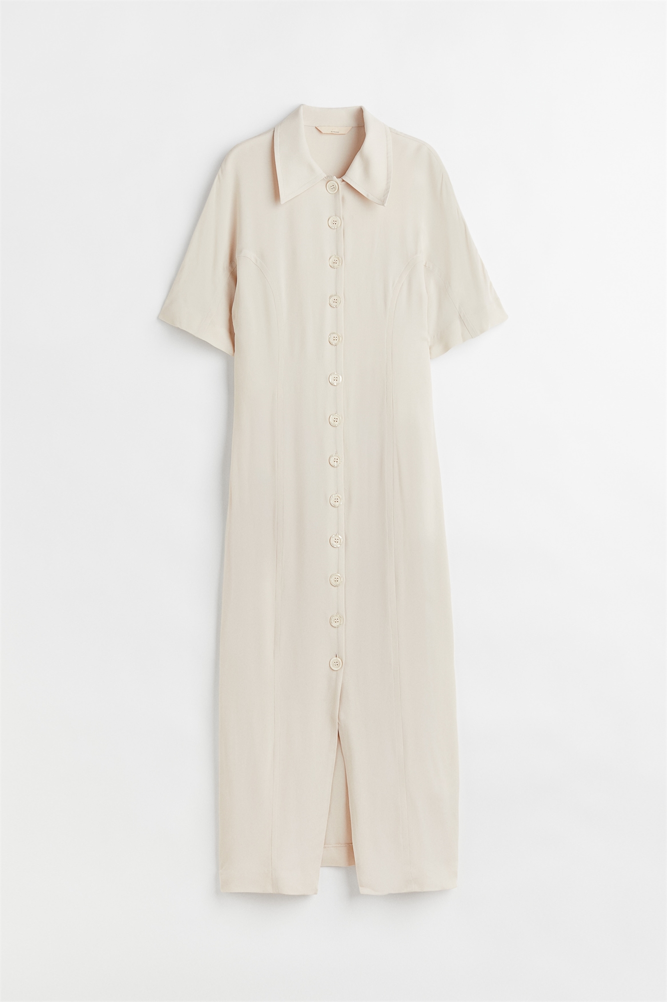 Креповое платье длиной до колен из смеси шелка и вискозы. Застегивается спереди на пуговицы, имеет отложной воротник и рукава длиной до локтя. Без подкладки.