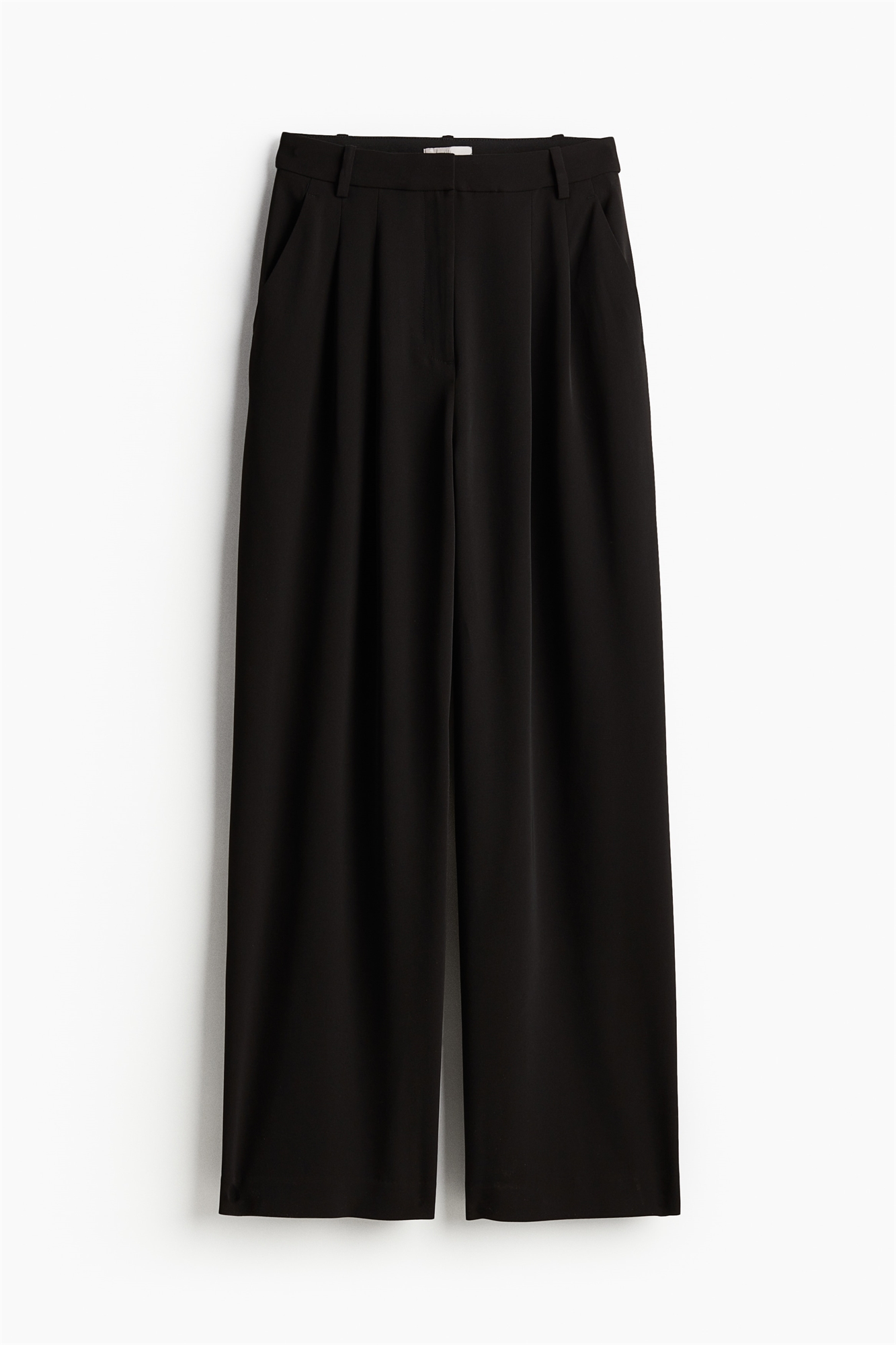 Приталенные брюки свободного кроя из тканого материала. Высокая талия со скрытой эластичной резинкой и ширинкой на молнии. Диагональные боковые карманы и втачные задние карманы. Широкие прямые ноги со складками спереди.