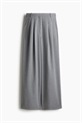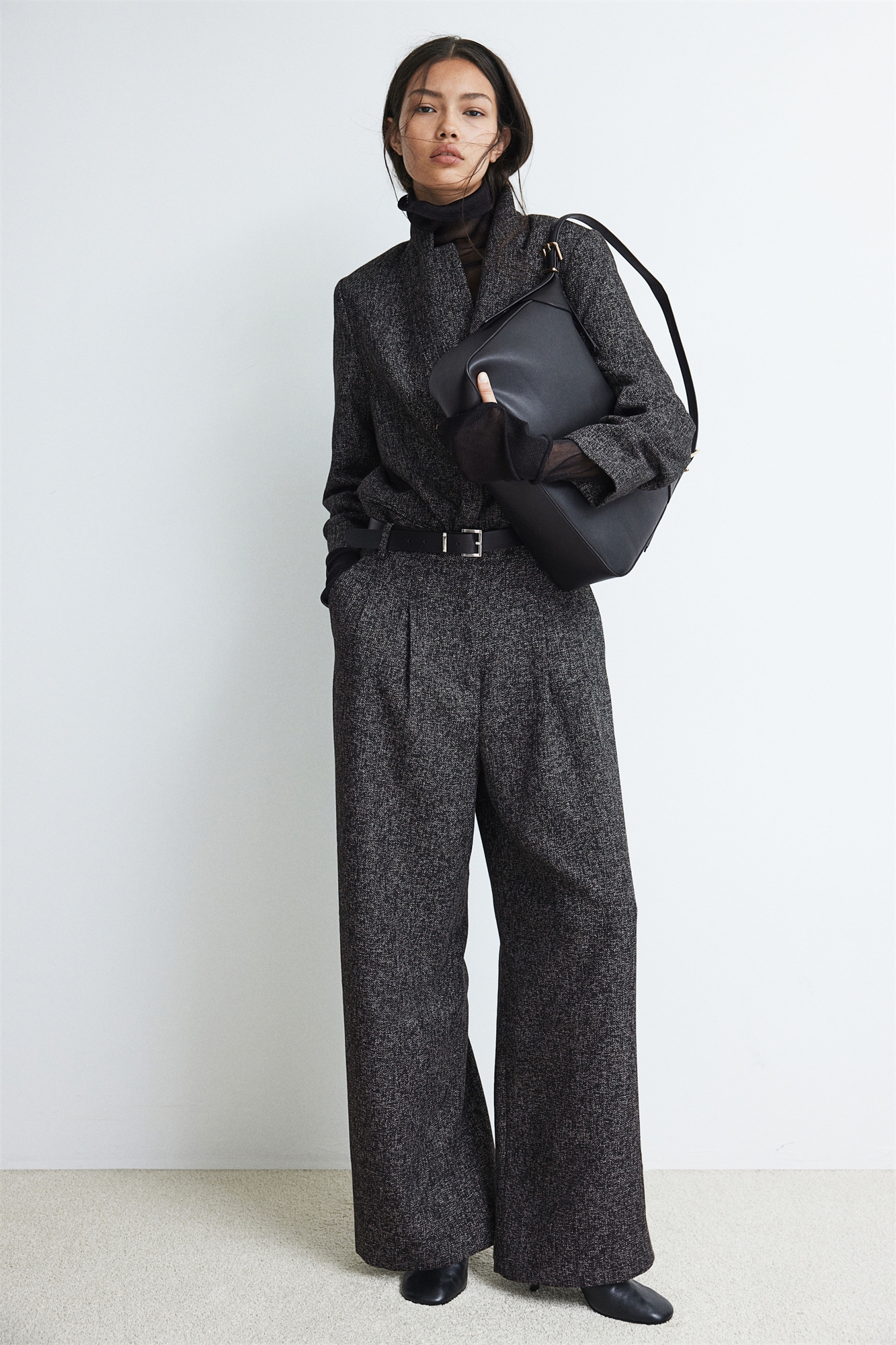 Приталенные брюки свободного кроя из тканого материала. Высокая талия со скрытой эластичной резинкой и ширинкой на молнии. Диагональные боковые карманы и втачные задние карманы. Широкие прямые ноги со складками спереди.