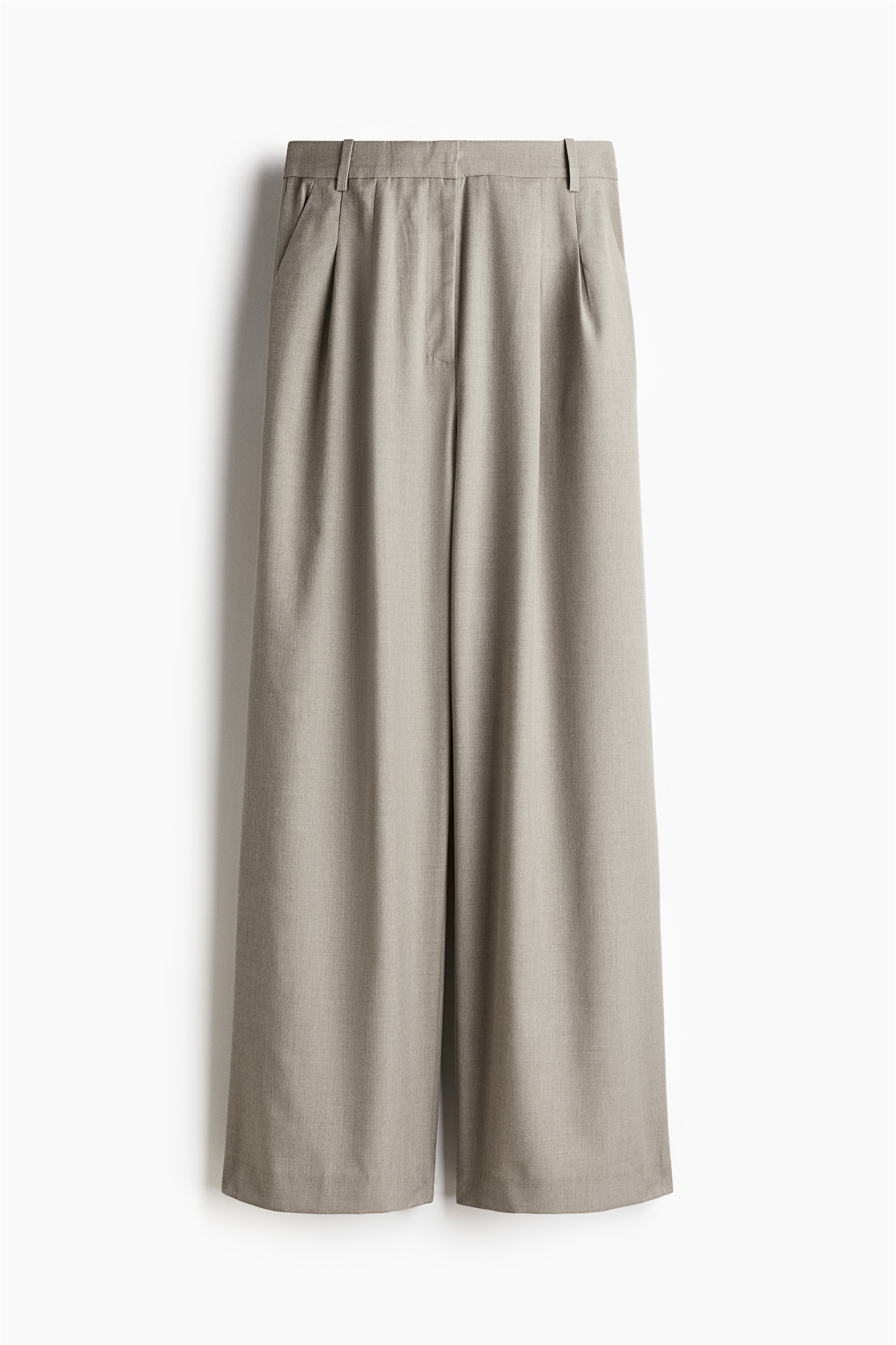 Приталенные брюки свободного кроя из тканого материала. Высокая талия со скрытой эластичной резинкой и ширинкой на молнии. Диагональные боковые карманы и втачные задние карманы. Широкие прямые ноги со складками спереди.