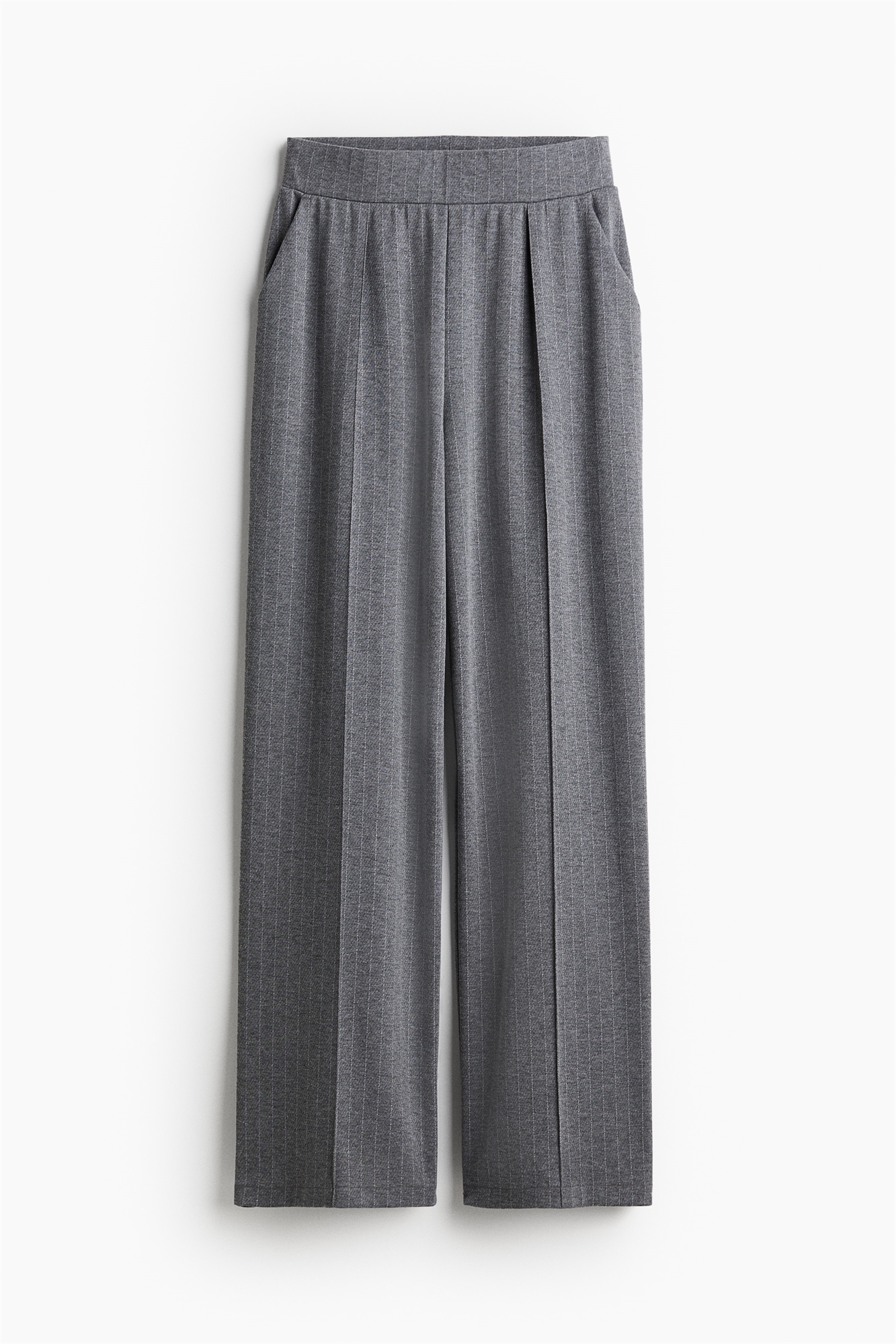 Приталенные брюки из джерси с высокой эластичной талией. Свободный крой с диагональными боковыми карманами и широкими ногами со складками в верхней части и складками спереди.