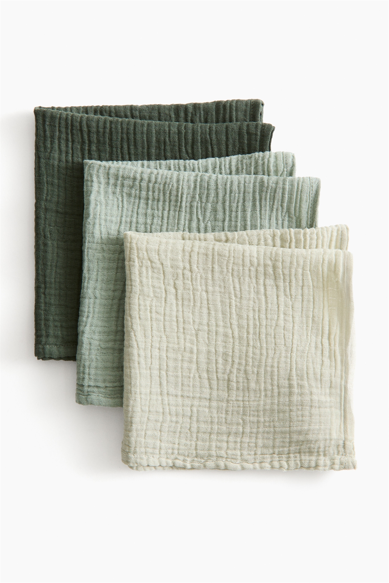 Салфетки из хлопкового муслина с хорошей воздухопроницаемостью подходят как в качестве комфортной ткани, так и для вытирания пролитых и прилипших вещей. Держите их в коляске, на пеленальном столике и на кухне. Салфетки становятся мягче с каждой стиркой.