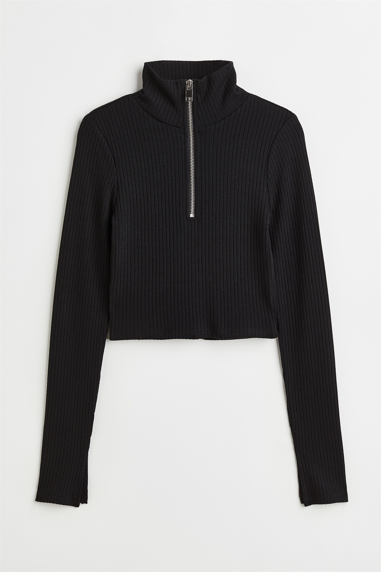 Короткий джемпер из мягкого трикотажа в рубчик с водолазкой, застежкой-молнией сверху и длинными рукавами с разрезом на конце.