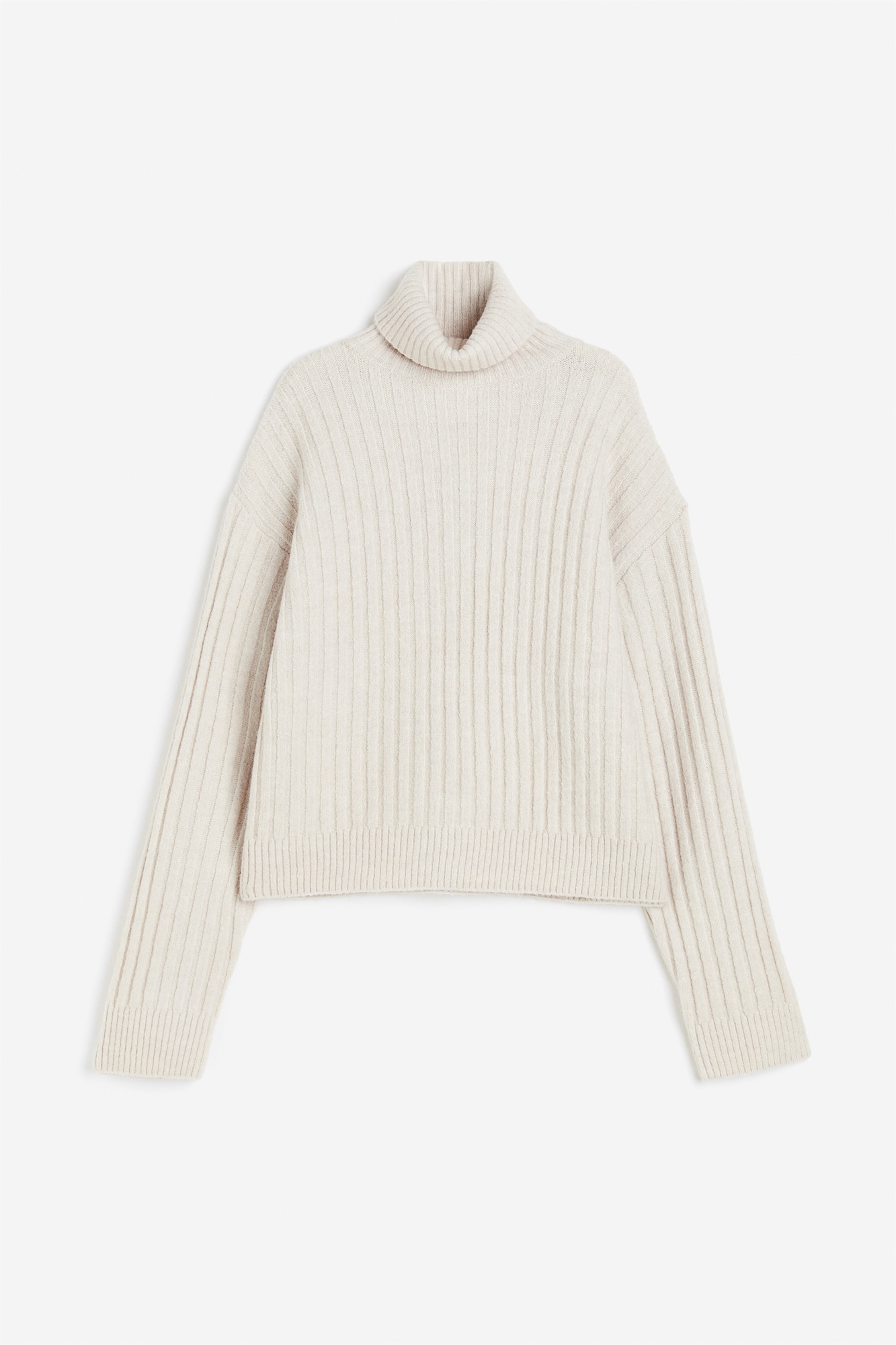 Джемпер из трикотажа в рубчик с добавлением шерсти, с горловиной поло, спущенными плечами и длинными рукавами.