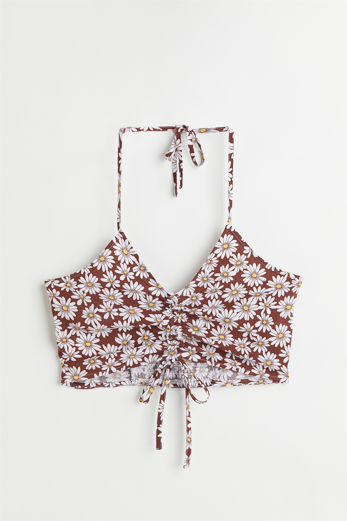 Обрезанный топ без рукавов с вырезом халтернек из узорчатой вискозы. Узкие бретели, завязывающиеся сзади на шее, и V-образный вырез с завязками спереди. Широкая планка сзади для удобной посадки. Без подкладки.