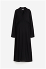 Платье длиной до колена из мятого полотна с воротником и пуговицами спереди для облегчения доступа к груди. Эластичная ткань под бюстом, слегка спущенные плечи и длинные рукава с манжетами на пуговицах. Разрезы сзади на подоле. Платье можно носить как во время беременности, так и при кормлении грудью после нее.