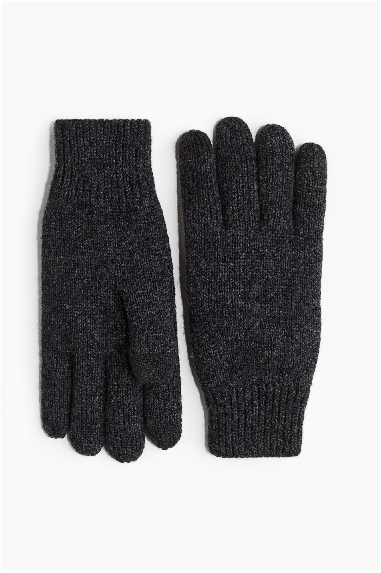 Перчатки из мягкого тонкого трикотажа с ребристыми манжетами. Верхняя часть большого, указательного и среднего пальцев выполнена из материала, совместимого с сенсорными экранами.