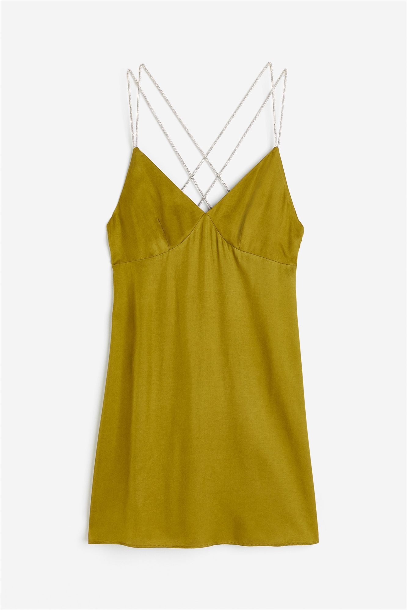 Короткое платье из мягко драпирующегося атласа с приталенным лифом и расклешенной юбкой. V-образный вырез и двойные узкие бретели-цепочки со стразами, перекрещивающиеся сзади. Скрытая молния сзади с застежкой на крючок и глазок. Бюст на подкладке с нижним швом.