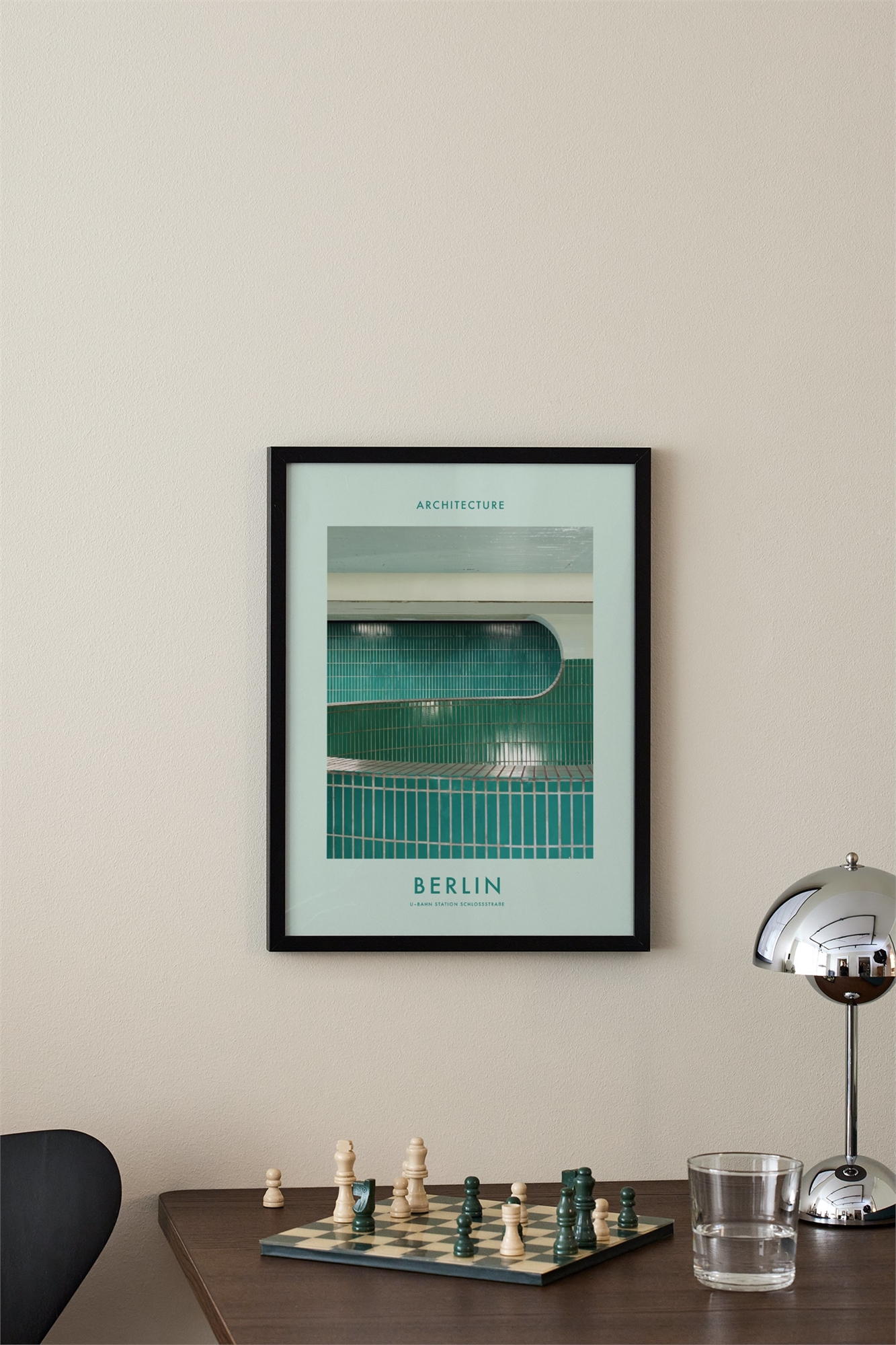 Берлин, Германия. Эта фотография запечатлела архитектуру станции метро на севере Германии. Редкая структура наряду с прямоугольными заголовками разных цветов зеленого цвета придают этому постеру уникальный смысл и стиль. Постер U-bahn Schlossstraße имеет встроенную рамку, которая элегантно обрамляет мотив.