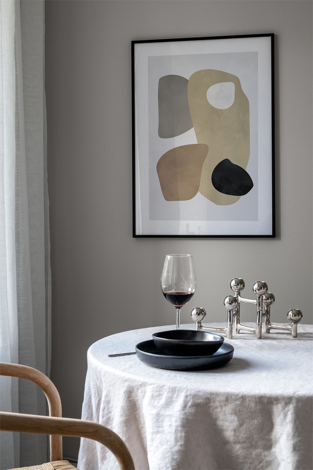 Графическая иллюстрация абстрактных фигур, накладывающихся друг на друга в мягких тонах бежевого, коричневого и черного. Светло-серый фон подчеркивает землистую цветовую гамму мотива. Структура иллюстрации создает ощущение мазков акриловой кисти. Встроенное белое паспарту элегантно обрамляет мотив.