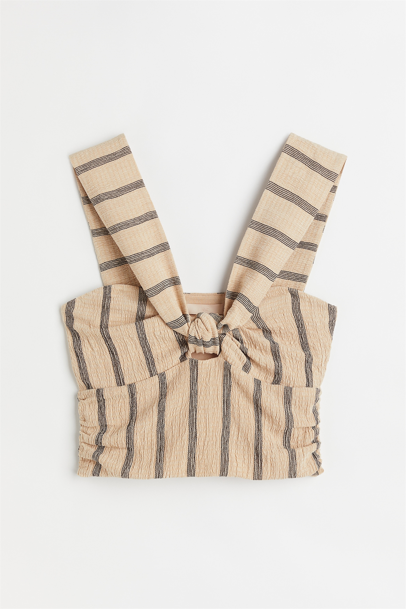 Короткий топ из махрового джерси с очень широкими двухслойными бретелями, переходящими в деталь с узлом спереди. Формованные чашечки и собранные боковые швы. На подкладке.