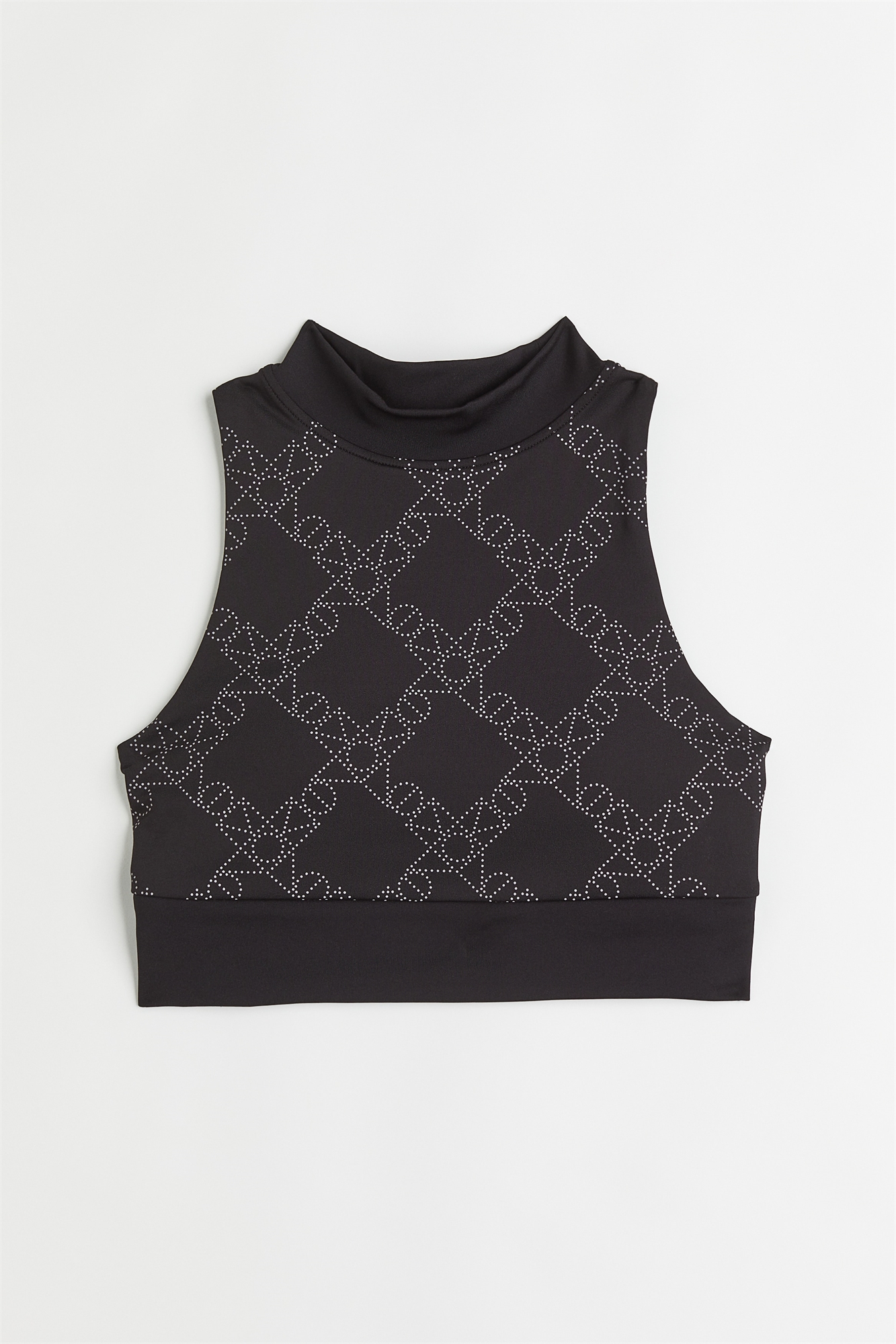 Спортивный бюстгальтер со светоотражающим принтом в виде монограммы из быстросохнущей функциональной ткани, которая помогает сохранить сухость и прохладу во время тренировок. Воротник-стойка, узкий крой в верхней части, чашечки на подкладке со съемными вкладышами, придающими форму бюсту, и спинка в стиле "рейсер". Без застежек. Средняя поддержка, подходящая для тренировок умеренной интенсивности.