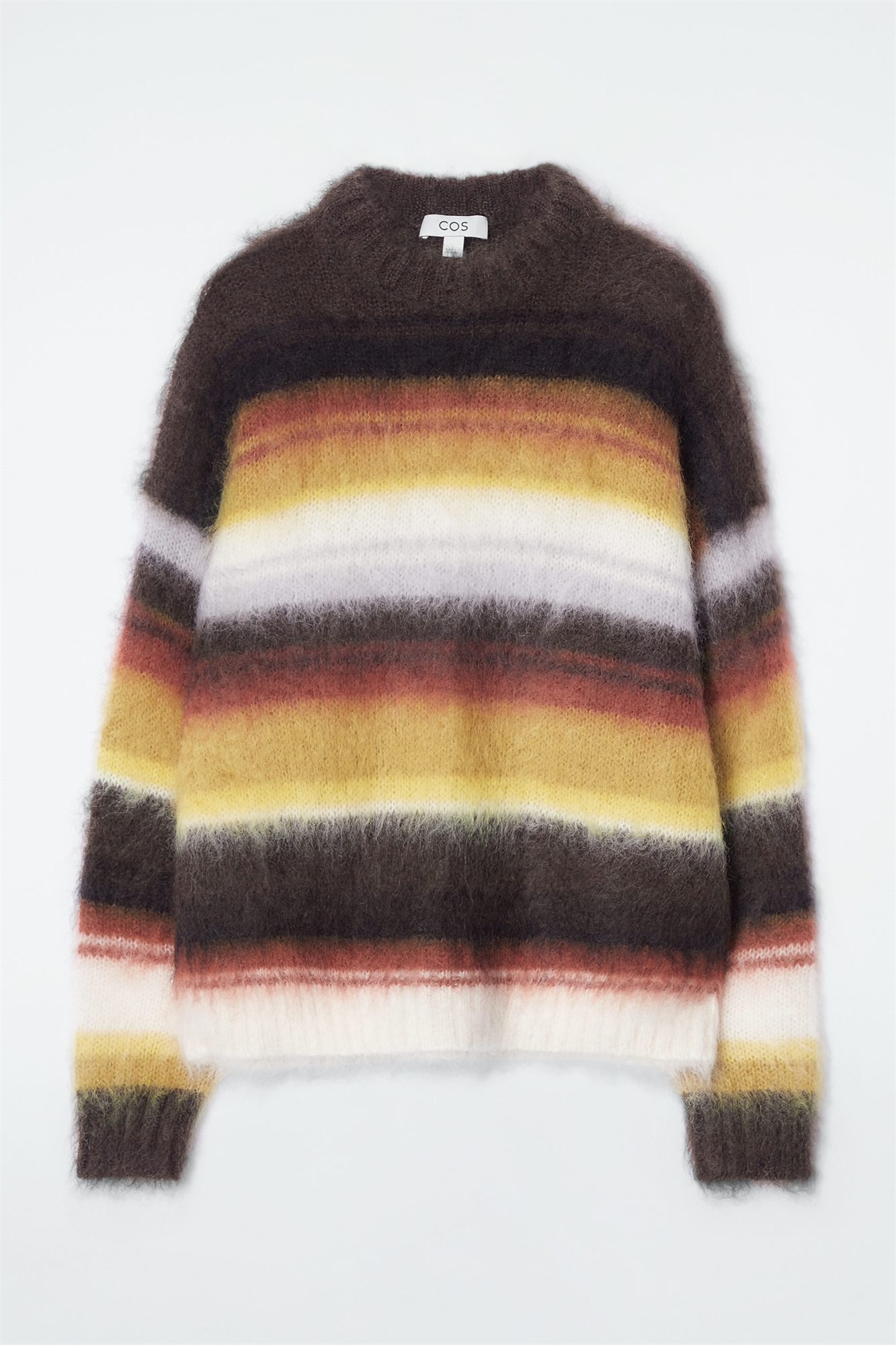 Этот веселый джемпер с полосками в земляных тонах - незаменимая вещь для прохладных месяцев. Он выполнен из смеси пушистой мохеровой шерсти и теплой мериносовой шерсти. Он имеет силуэт "кокон", непринужденные спущенные плечи и круглый вырез, который сохраняет форму благодаря широким ребристым манжетам. Свободный крой Эта вещь сертифицирована по стандарту Responsible Mohair Standard (RMS) Control Union 893290 и содержит волокна мохера с ферм, сертифицированных в соответствии с правилами благополучия животных и сельскохозяйственными нормами Внешний материал: 70% мохеровой шерсти RMS, 30% мериносовой шерсти. Детали исключены/Сухая чистка Длина по спинке в размере S = 64 см/Модель носит размер S