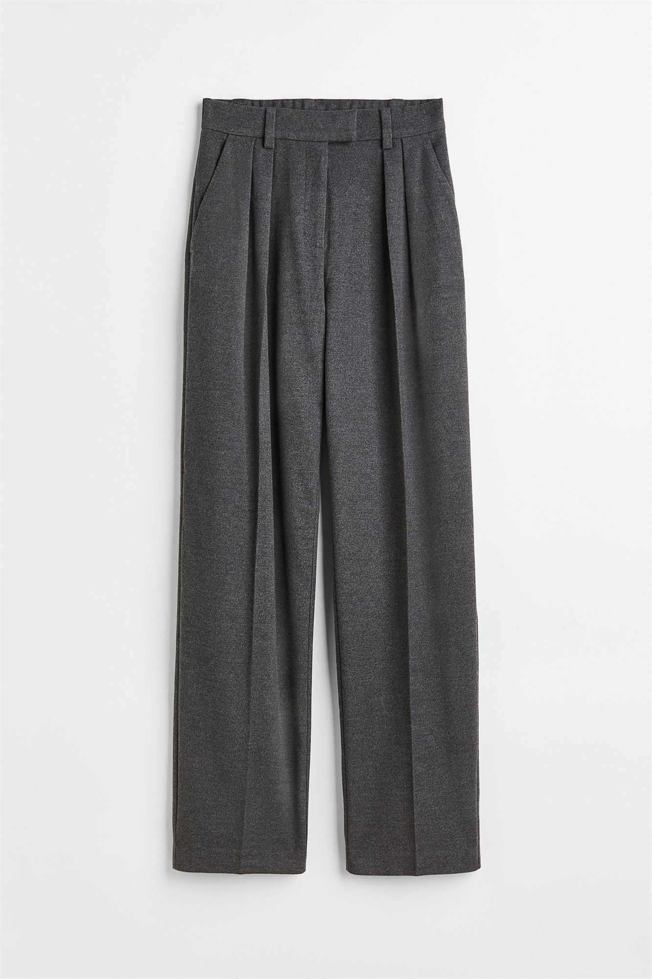 Приталенные брюки из саржи из смеси вискозы. Свободный крой с высокой талией, застежка на молнию с потайными застежками-крючками и эластичная резинка сзади. Диагональные боковые карманы, втачные задние карманы и слегка зауженные ноги со складками.