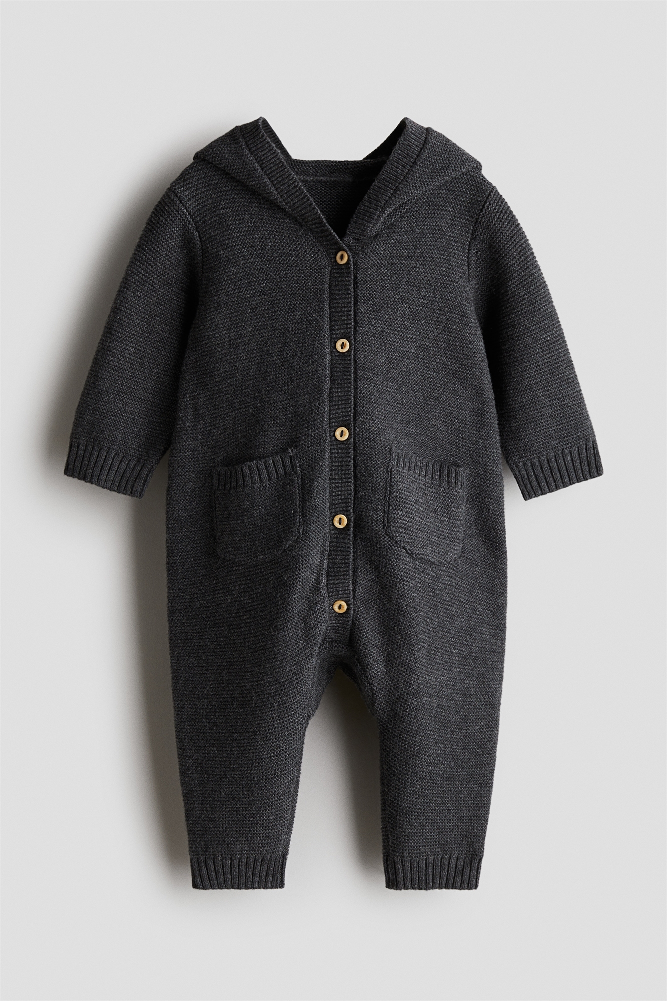 Костюм-ромпер из мягкого хлопкового трикотажа с капюшоном с аппликацией в виде ушей, пуговицами спереди и накладными карманами с ребристой отделкой. Окантовка капюшона, манжет и каймы.