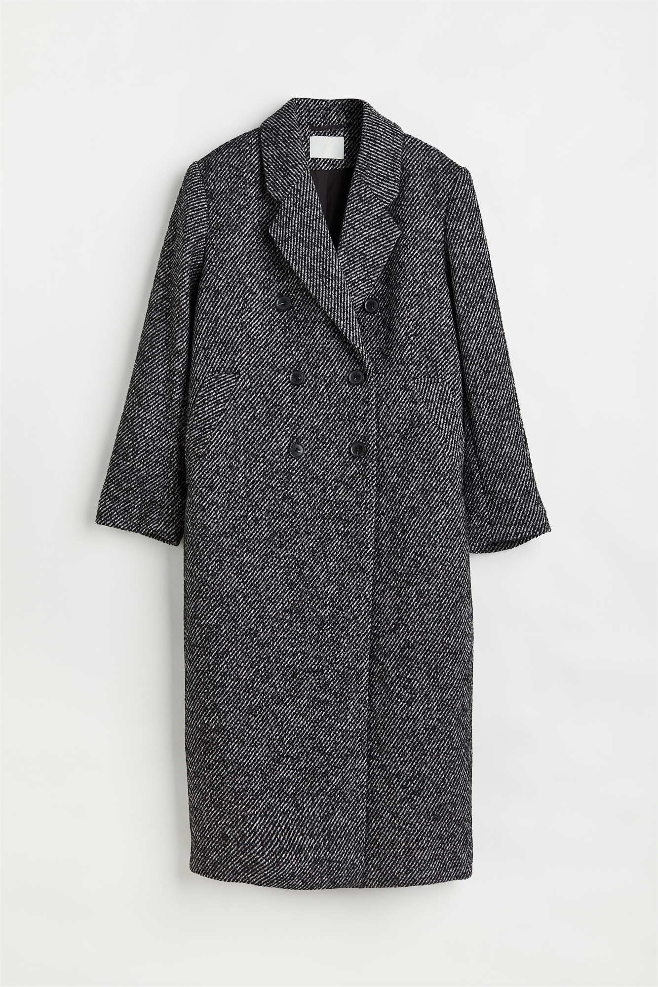 Двубортное пальто длиной до колен из шерстяного микса. Свободный крой, лацканы с вырезом, пуговицы спереди и прорезные карманы по бокам. Длинные рукава с подплечниками и декоративными пуговицами. Потайной разрез сзади. На подкладке.