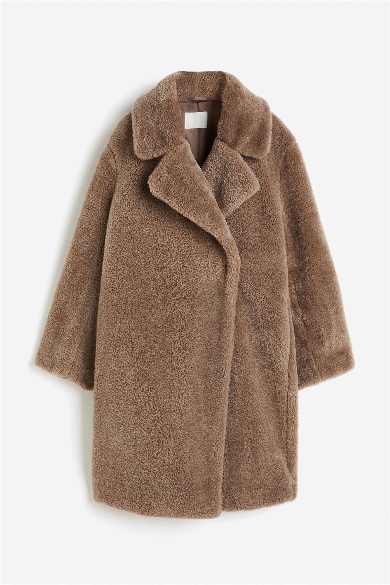 Пальто длиной до колена из мягкой пушистой ткани с широким отложным воротником и потайными застежками-шпильками спереди. Повседневный крой с опущенными плечами, неброскими боковыми карманами и прямым подолом. На подкладке.