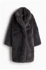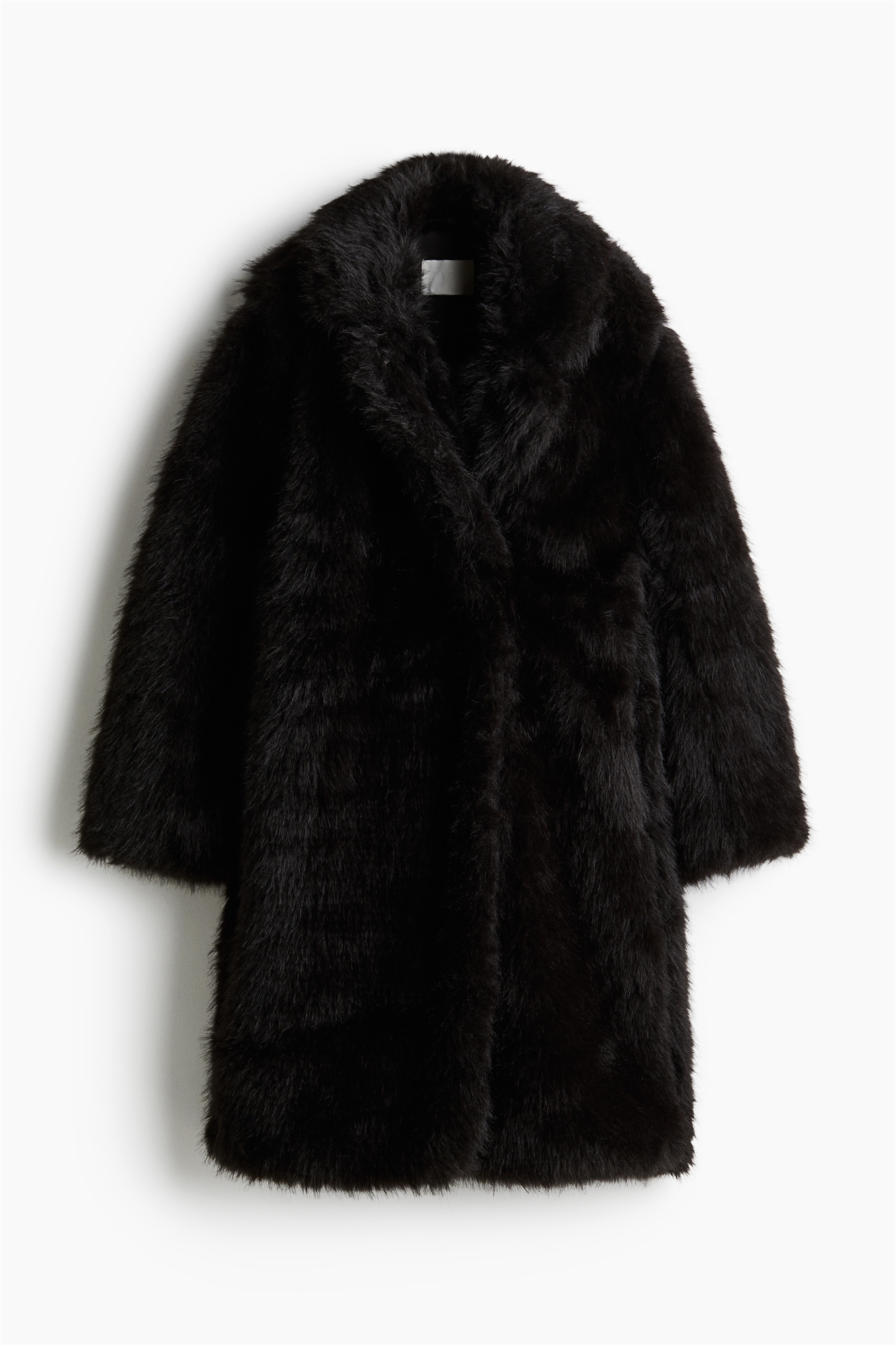 Пальто длиной до колена из мягкой пушистой ткани с широким отложным воротником и потайными застежками-шпильками спереди. Повседневный крой с опущенными плечами, неброскими боковыми карманами и прямым подолом. На подкладке.
