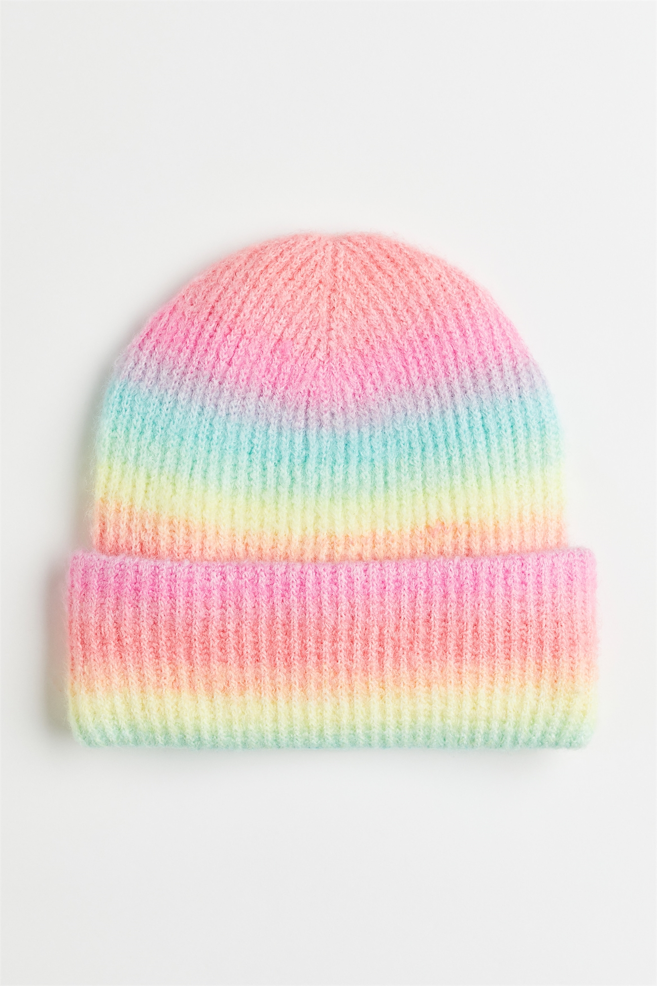 Шапка из мягкого трикотажа в рубчик с отворотом на подоле.