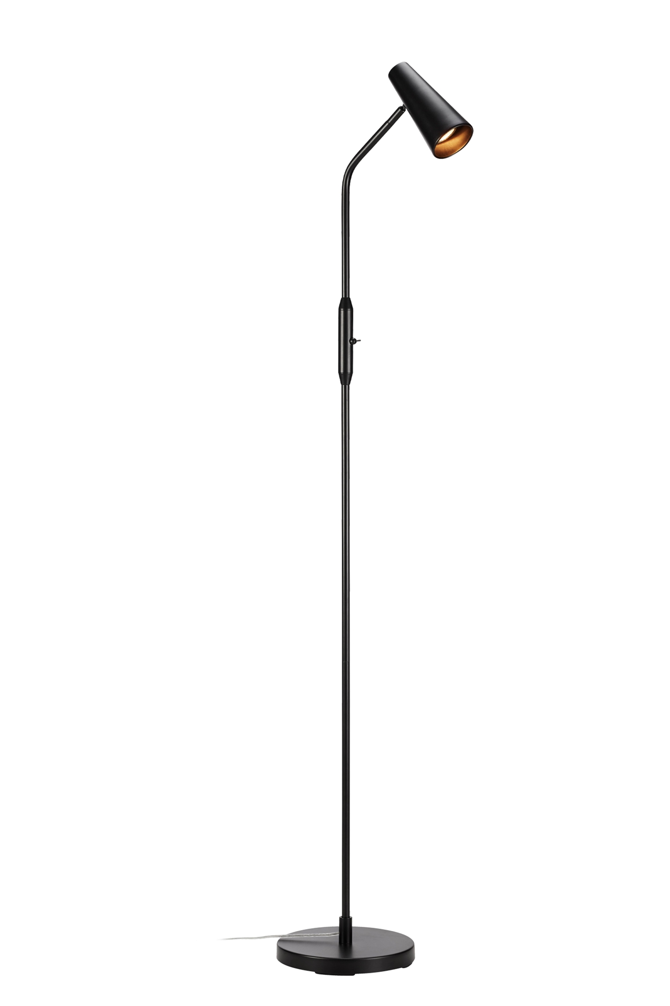Минималистичный черный торшер с регулируемым абажуром. Для светильника требуется лампочка с цоколем GU10 мощностью не более 7 Вт, в комплект не входит. Прозрачный кабель длиной 2 м. Размер лампы: 36 см в ширину, 23 см в глубину, 145 см в высоту.