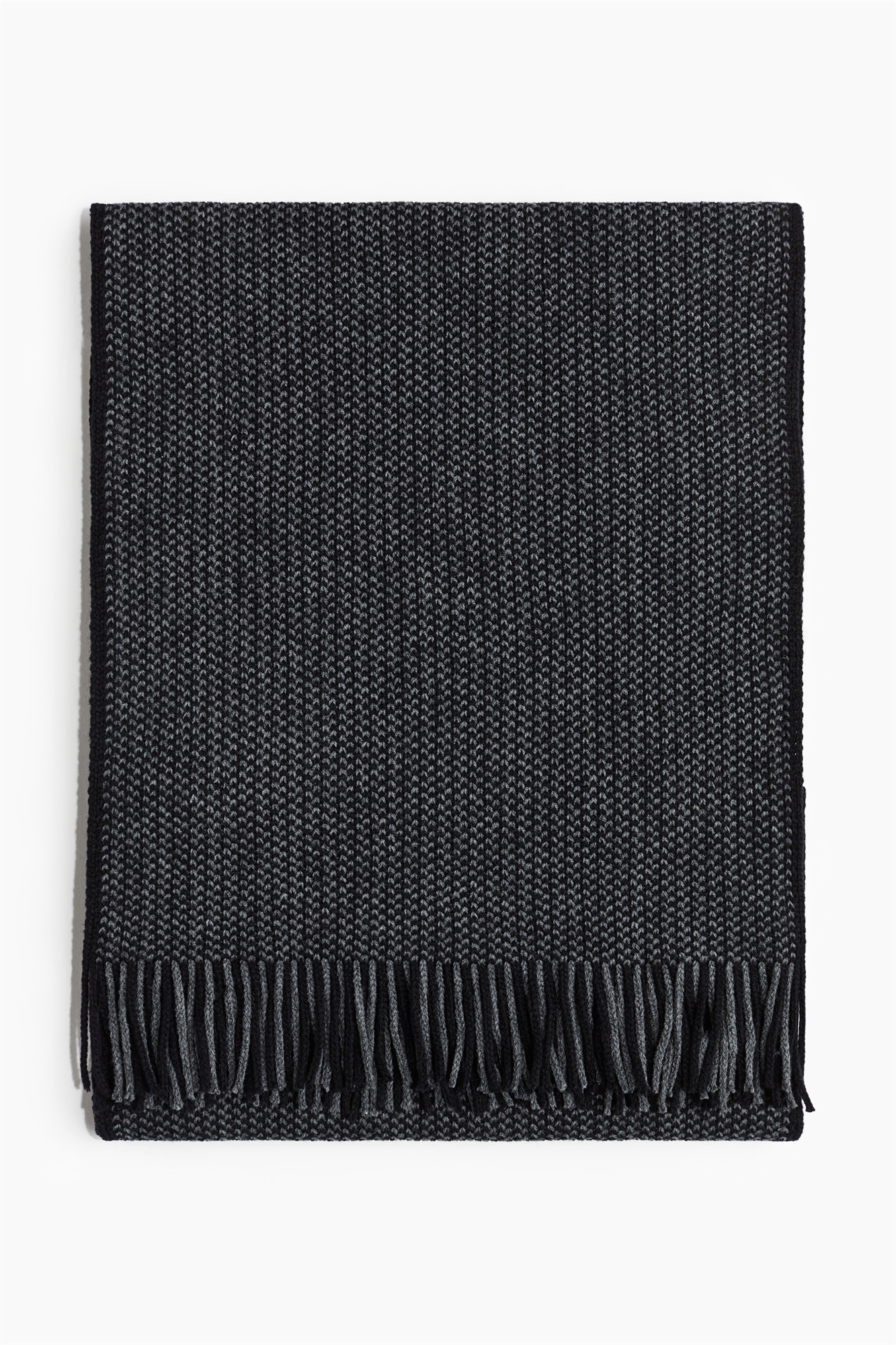 Шарф из мягкого трикотажа в рубчик с бахромой по коротким сторонам.