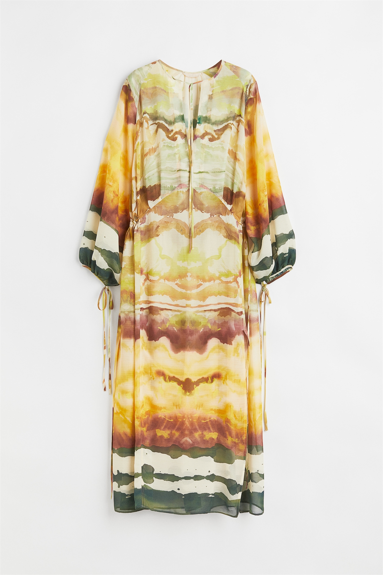 Длинное платье оверсайз из набивного тканого материала. Круглый вырез с V-образной проймой и узкими завязками. Длинные широкие рукава с узкими завязками на концах. Завязки на талии с узкими завязками по бокам и боковыми разрезами на подоле. Без подкладки.