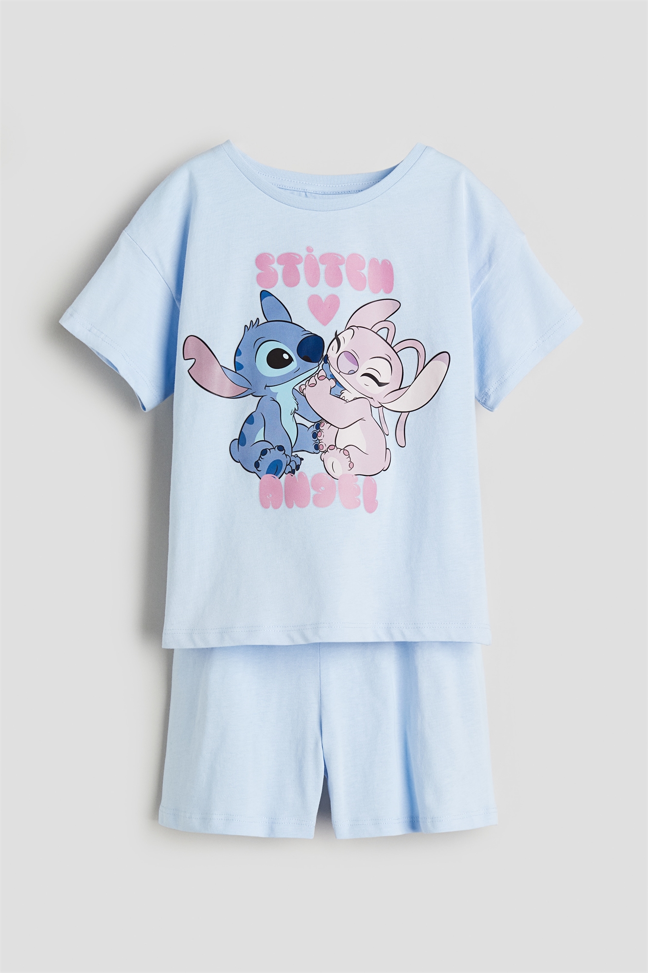 Пижама из мягкого хлопкового джерси с принтом. Футболка с круглым вырезом с ребристой отделкой и спущенными плечами. Шорты с эластичным поясом.