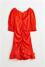 Короткое облегающее платье из вискозной ткани. С V-образным вырезом и короткими пышными рукавами. Собранный шов спереди создает эффект драпировки. Потайная застежка-молния сбоку и двойной волан на подоле. Без подкладки.