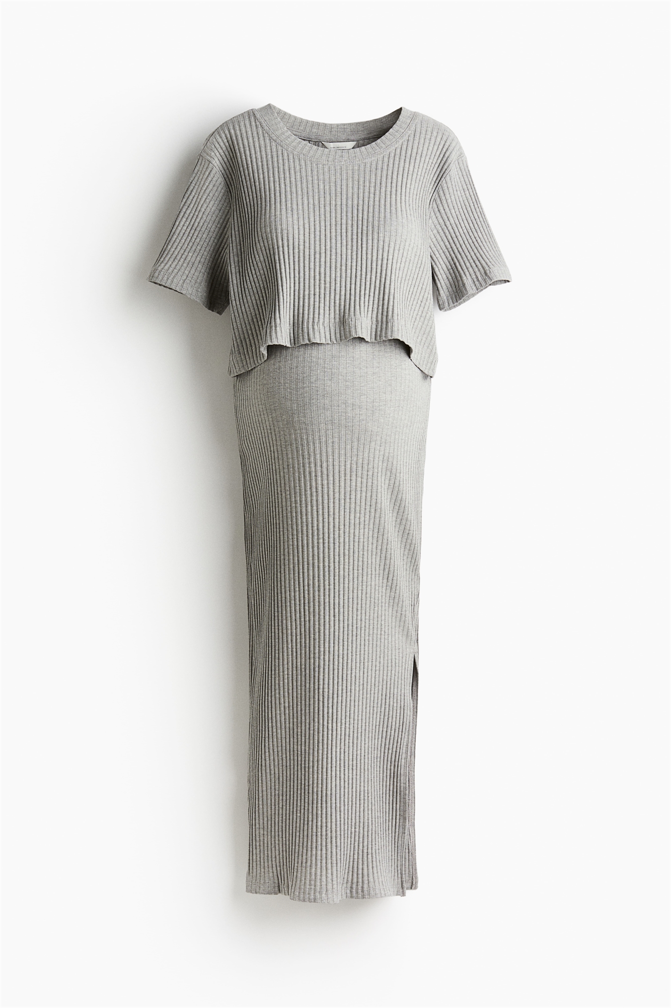 Комплект из обрезанной футболки и юбки длиной до щиколоток из мягкого, ребристого хлопкового джерси. Футболка имеет круглый вырез с отделкой и слегка спущенные плечи. Юбка с высокой талией и эластичной отделкой, а также разрезом на подоле с одной стороны.