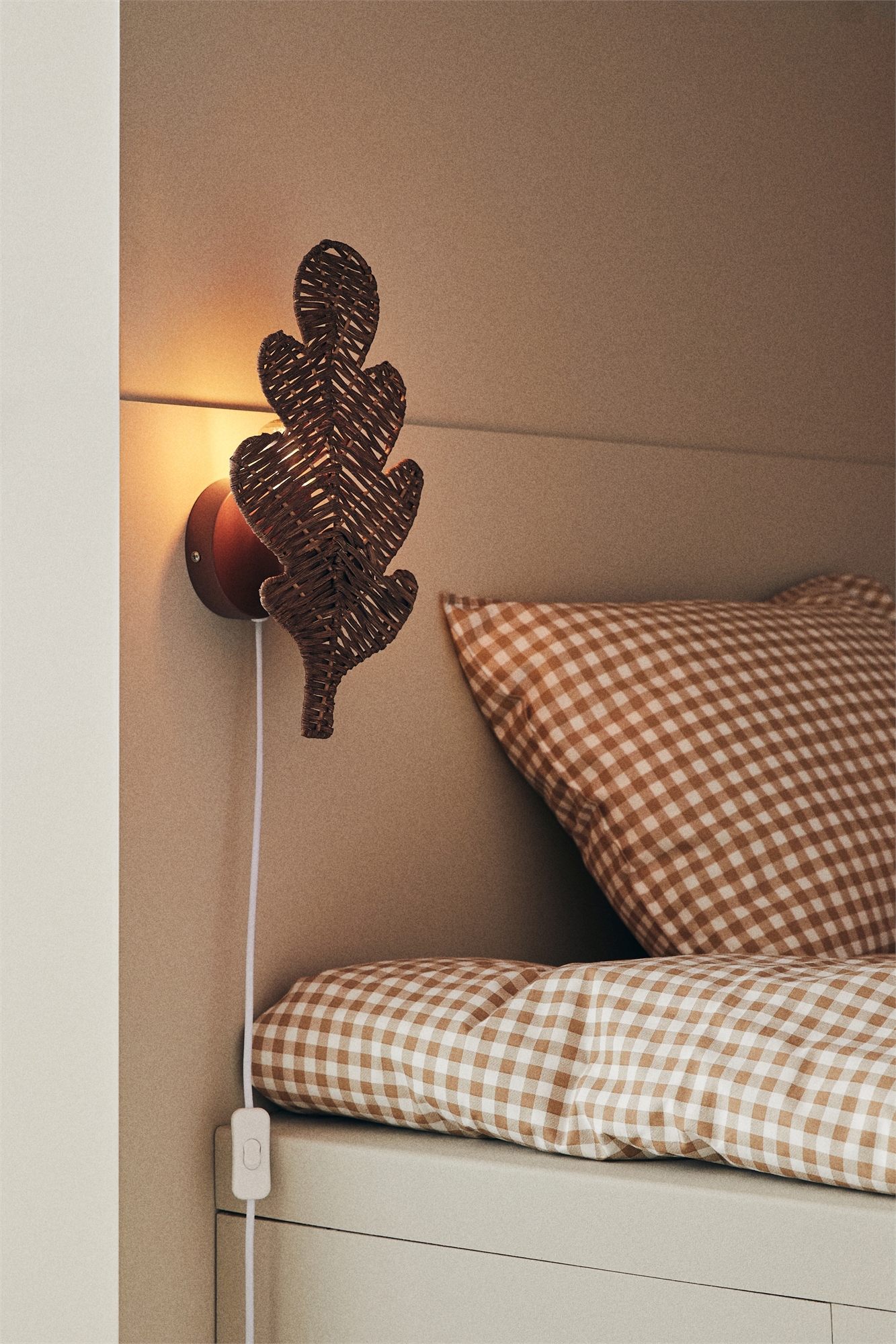 Настенный светильник из ротанга в форме дубового листа. Отражатель рассеивает теплый рассеянный свет в комнате. Металлический настенный кронштейн и кабель с пластиковым выключателем. Для источников света с цоколем E14. Максимальная мощность 6 Вт. Лампочка в комплект не входит. Глубина 9 см. Высота 35 см.