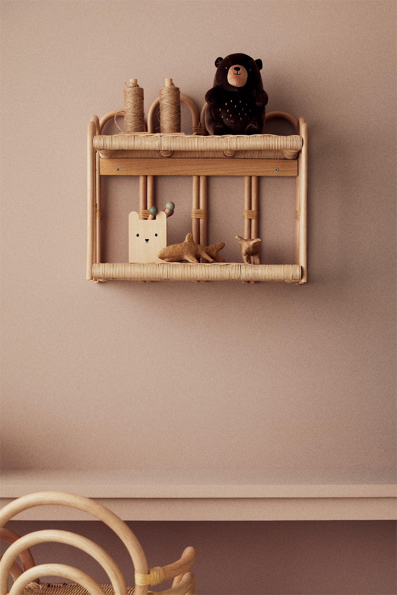 Настенная полка из ротанга для детской комнаты с двумя полками для книг или игрушек. Шурупы для крепления к стене не входят в комплект. Глубина 23 см. Высота 44 см. Ширина 46 см.