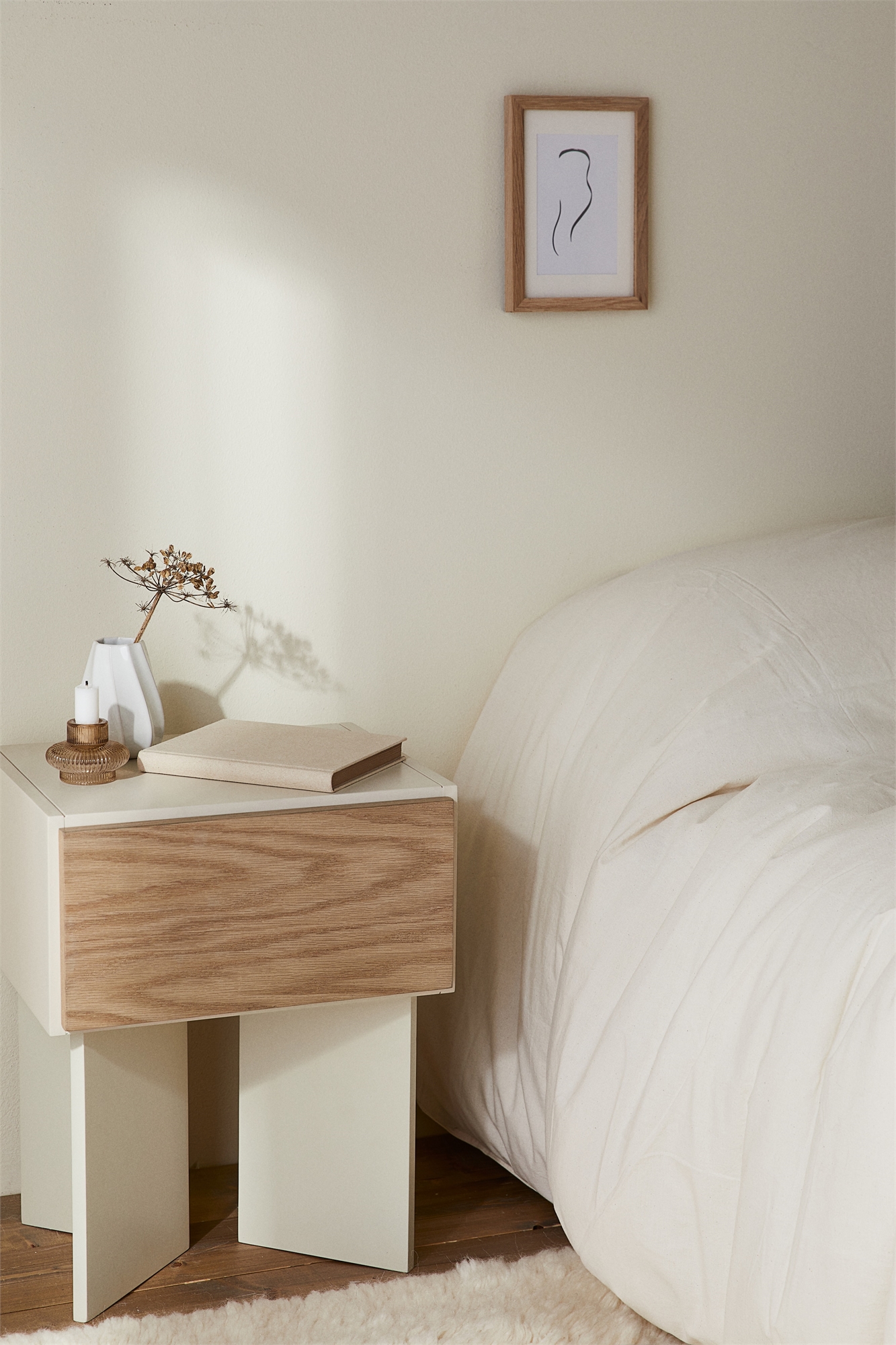 Прикроватная тумба из МДФ с выдвижным ящиком в верхней части, фасад из лакированного шпона. Поставляется в частично собранном виде. Винты входят в комплект. Глубина 34 см. Ширина 40 см. Высота 50 см.