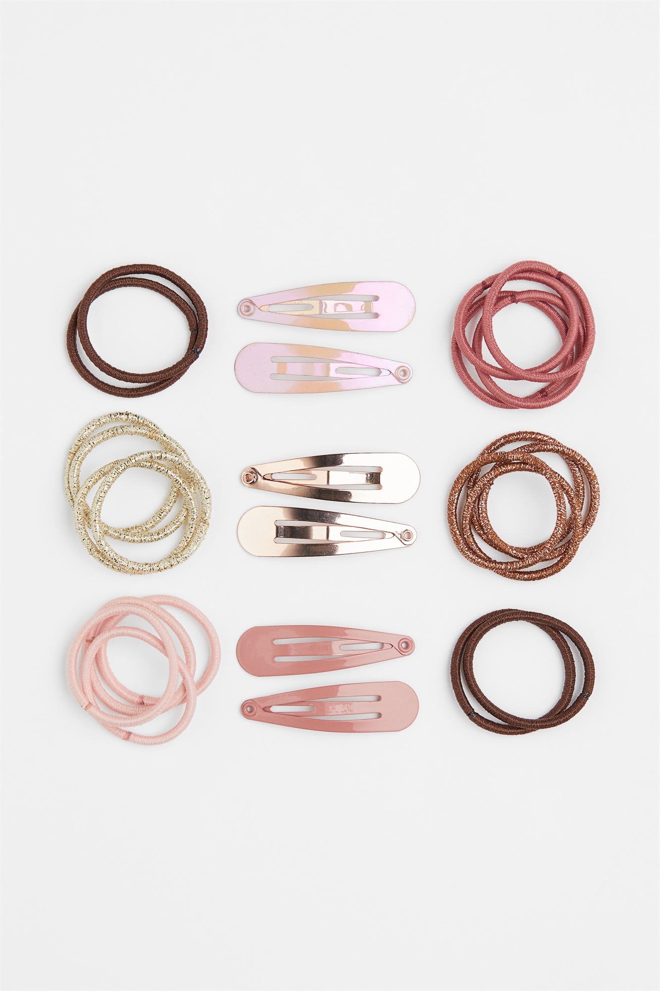 В упаковке шесть зажимов для волос и 20 резинок для волос без зажимов разных цветов. Длина зажимов для волос 4 см. Окружность резинок для волос 8 см.