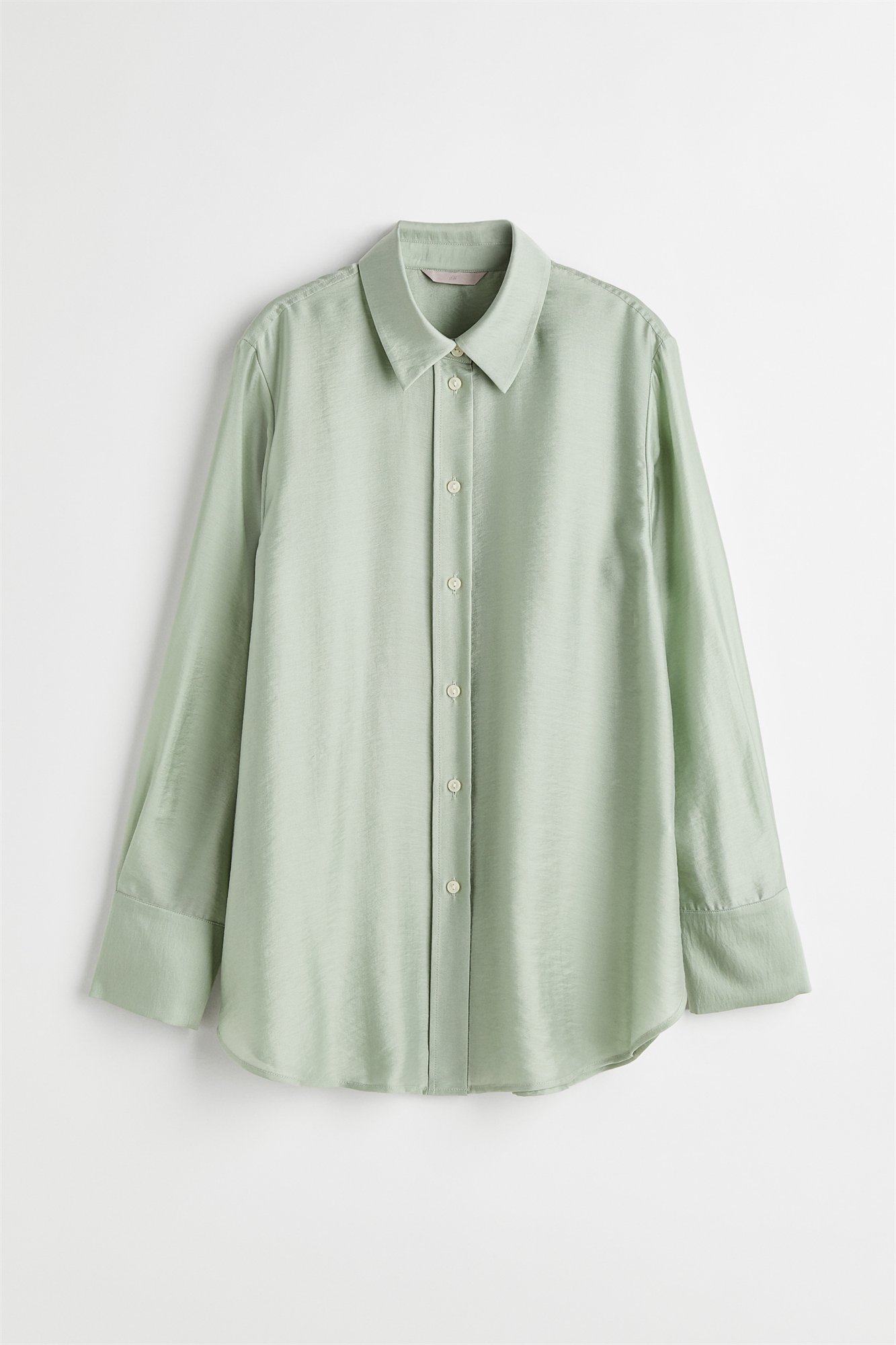 Блузка-рубашка из смеси лиоцелла с заостренным воротником, застежкой на пуговицы и слегка спущенными плечами. Манжеты на пуговицах и закругленный подол. Свободный крой.