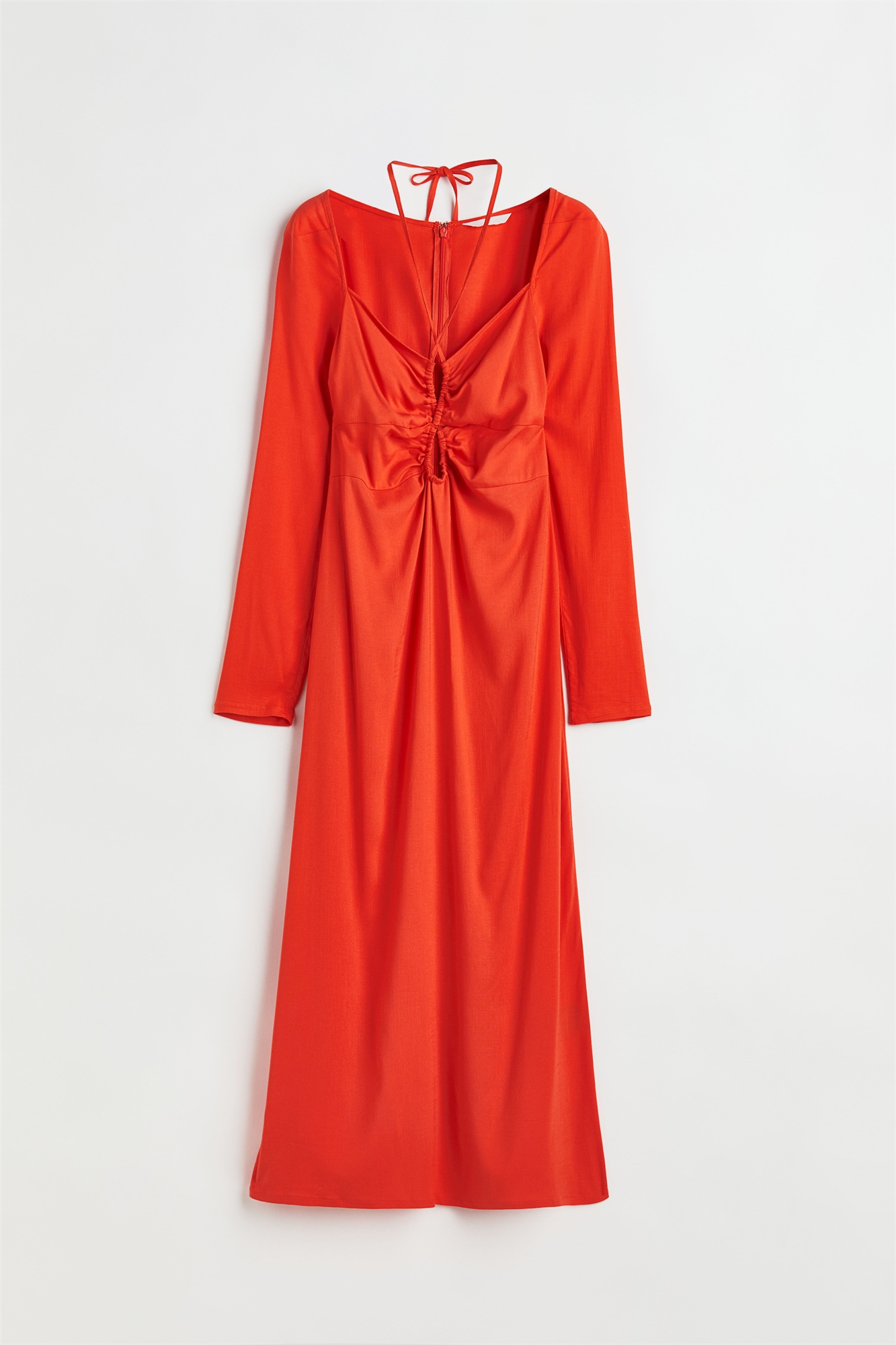 Облегающее платье длиной до колен из воздушной вискозы. Горловина халтер с завязками и вырезами спереди, а также узкие завязки, застегивающиеся сзади на шее. Вырез в форме сердца, длинные рукава и подол прямого кроя с разрезом сзади. Скрытая застежка-молния и застежка-крючок сзади. Без подкладки.