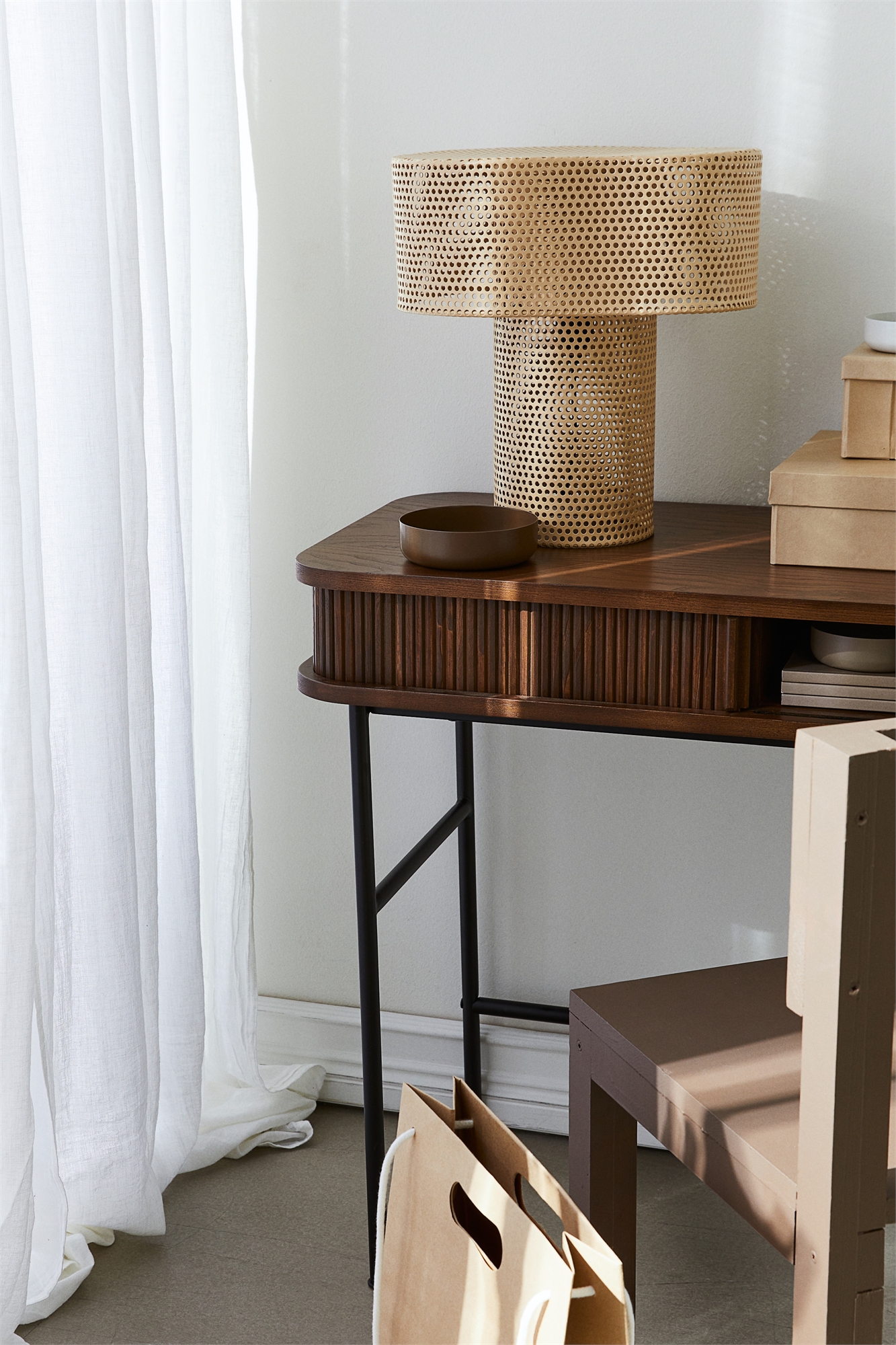 Настольная лампа с основанием и абажуром из металлической сетки, которая рассеивает свет и создает теплую атмосферу. Для источников света с цоколем E27. Максимальная мощность 15 Вт. Лампочка в комплект не входит. Глубина 25 см. Ширина 35 см. Высота 36 см. Кабель с текстильным покрытием и пластиковым выключателем. Длина кабеля: 160 см.