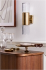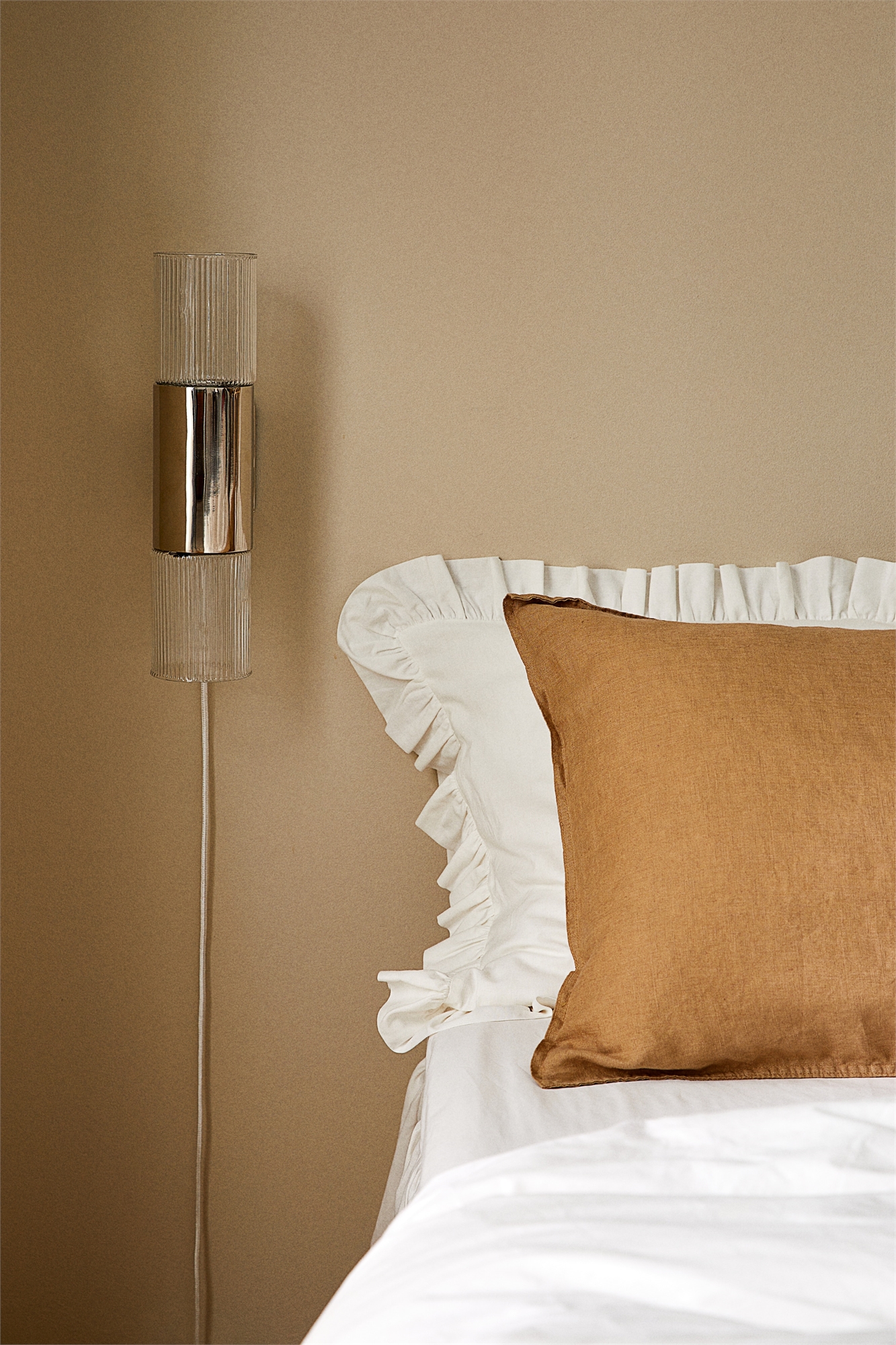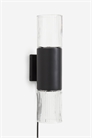 Настенный светильник из прозрачного рифленого стекла. Металлическое крепление на стену и шнур с тканевой оболочкой, пластиковый выключатель. Патроны E14. Максимальная мощность 4 Вт. Лампочки в комплект не входят. Диаметр 9,4 см. Высота 34 см. Длина шнура 240 см.