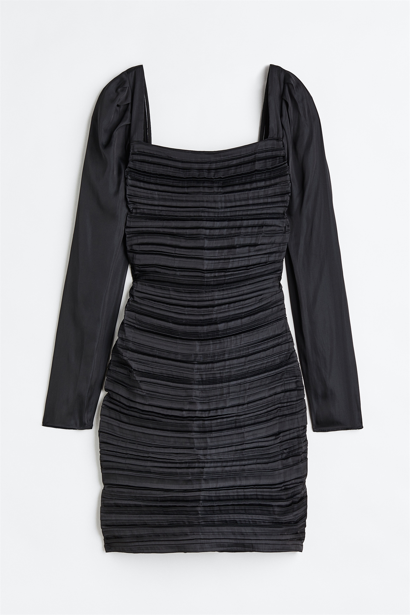 Короткое приталенное платье из плиссированного атласа с квадратным вырезом, длинными пышными рукавами и потайной застежкой-молнией сзади. На подкладке.